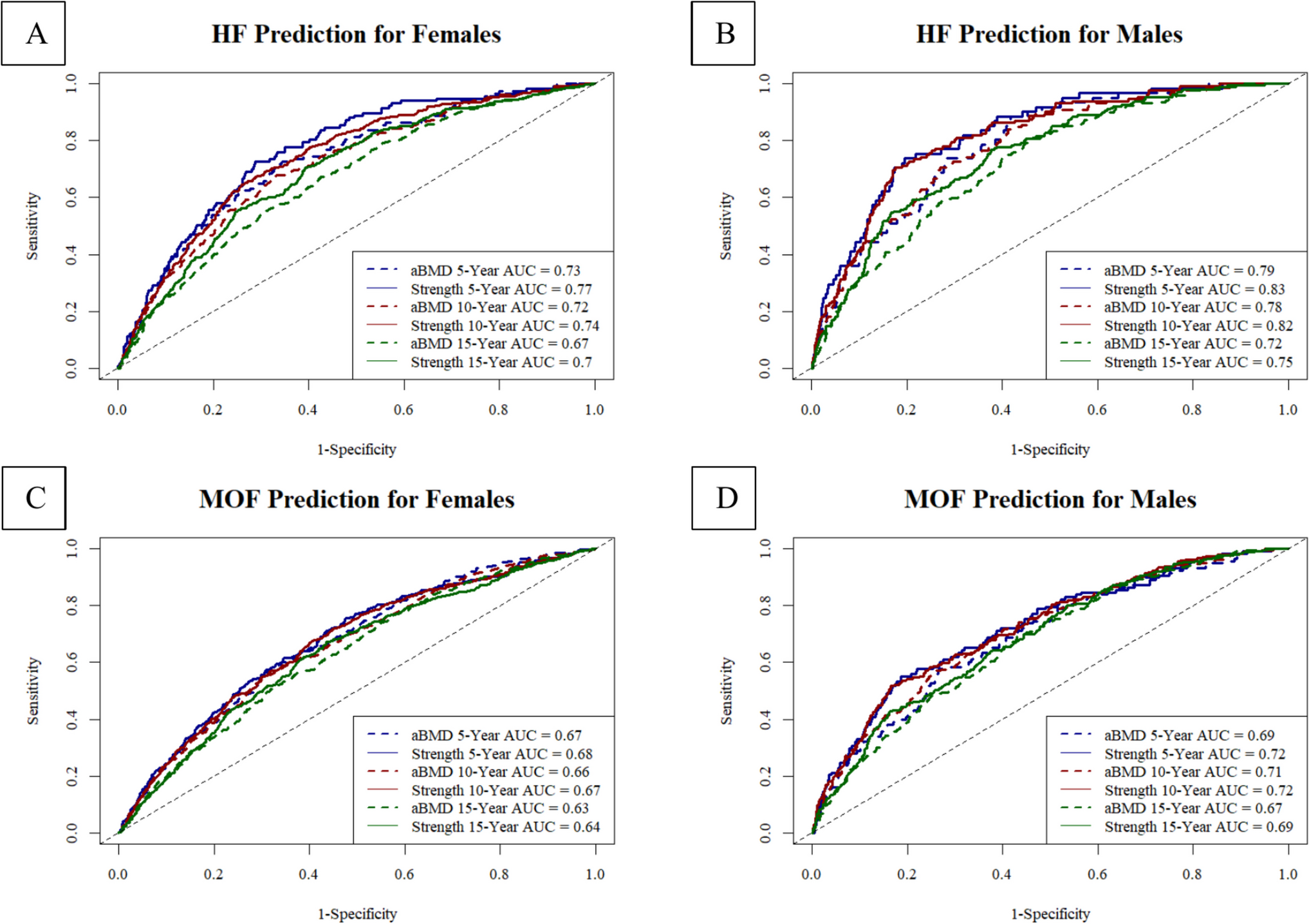It remains to be investigated whether utilizing CT imaging data from over a decade ago is still effective for assessing fracture risk. For instance, assuming that the AUC of femoral strength at 14 years is adequate for clinical prognosis of HFs, aBMD would only be considered equally effective for up to 10 years in females and 11 years in males. This suggests that femoral strength can be utilized for a longer duration with reliable discriminatory accuracy compared to aBMD in predicting future HFs. For MOFs, the ability of femoral strength to perform comparably to aBMD in predicting these fractures highlights its potential as a prognostic biomarker in clinical settings, especially for opportunistic screening with existing CT scans [25].