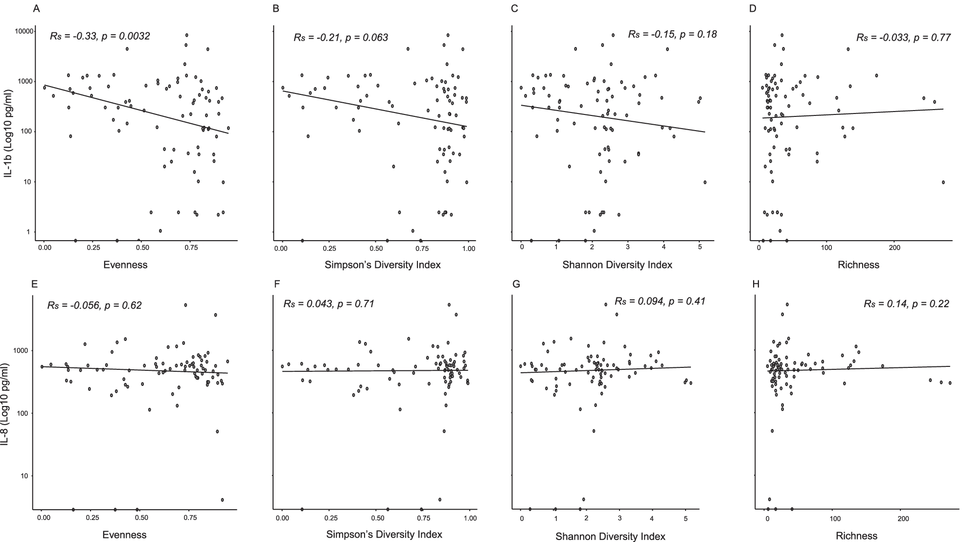 Patients with more dysbiosis and loss of diversity also had higher levels of IL-1b in BAL fluid. This positive association could be related to the increased activation of the inflammasome complexes as demonstrated by Trachalaki et al. [