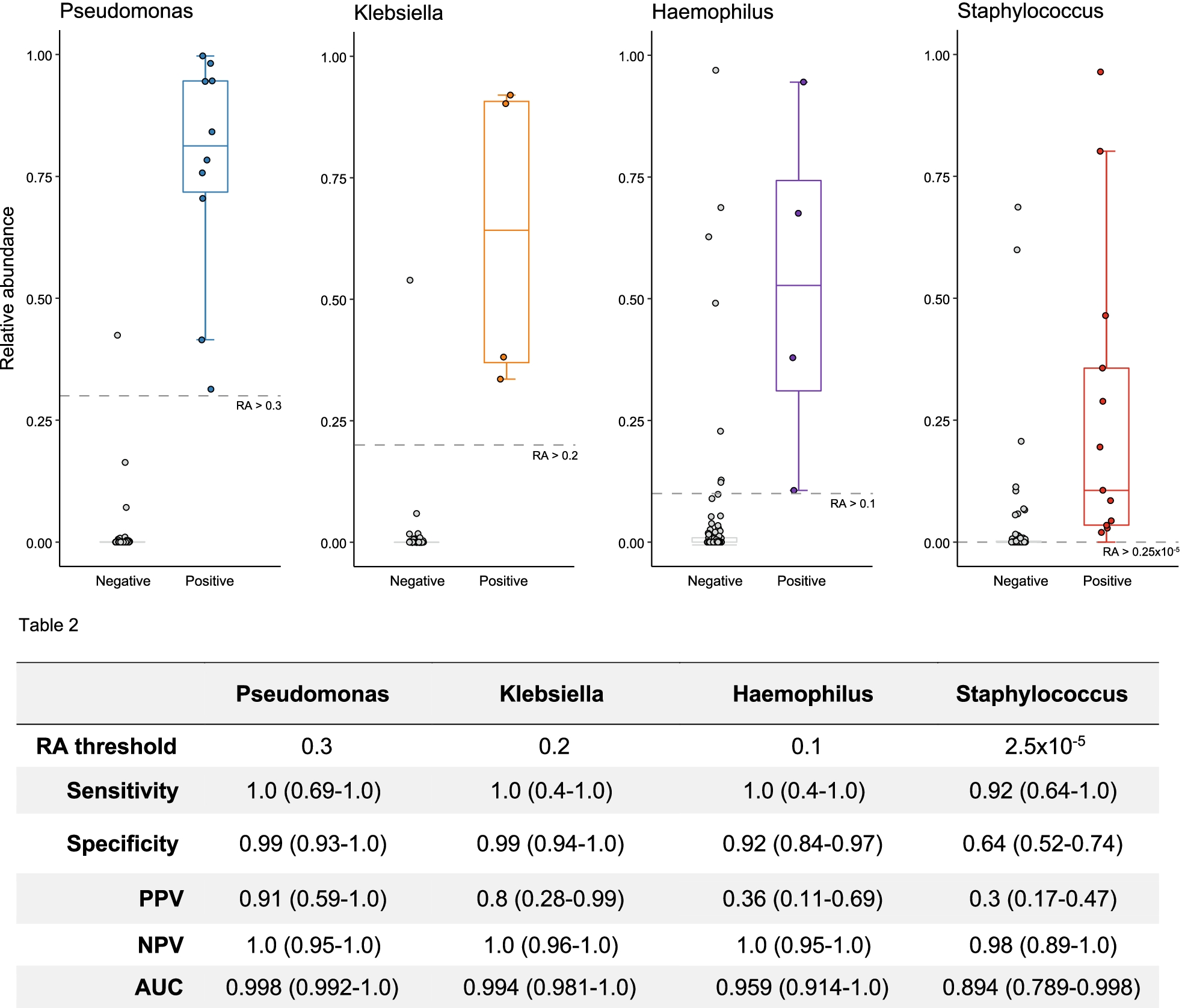 20]. Using this cut-off, the BALF relative abundance was then dichotomised before two-by-two contingency tables were constructed for each pathogen. Diagnostic test characteristics are reported for this cut-off [sensitivity, specificity, positive predictive value (PPV) and negative predictive value (NPV)]. Specificity and predictive values of 16s rRNA bacterial analysis were calculated with 95% binomial confidence intervals.