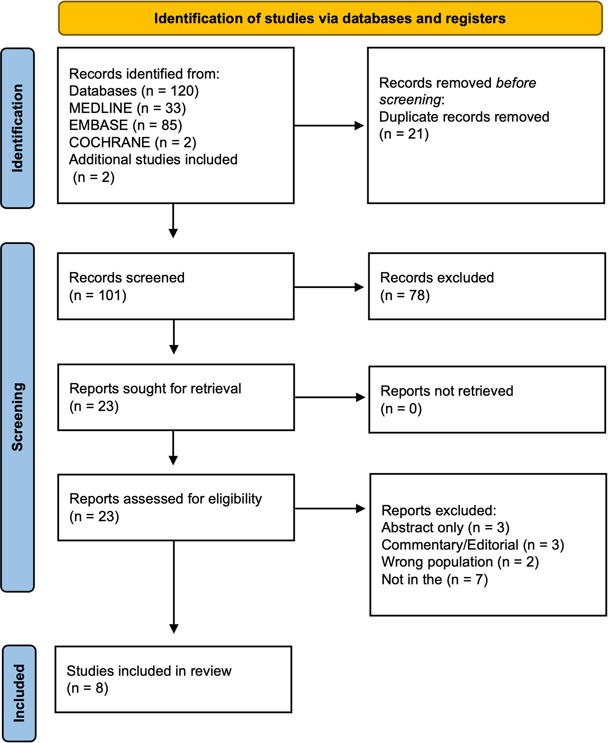 The initial query of the Medline, Embase, and Cochrane databases resulted in 120 articles. After duplicates were removed and two additional publications were added through manual searching, there were 101 studies. The titles, abstracts, and keywords of the remaining articles were reviewed to determine initial relevancy, and 23 articles remained. Full-text reviews of the remaining articles were conducted, and 8 of these articles met the inclusion criteria. Figure 1 provides a detailed illustration of the study identification and selection process, adhering to the PRISMA guidelines.