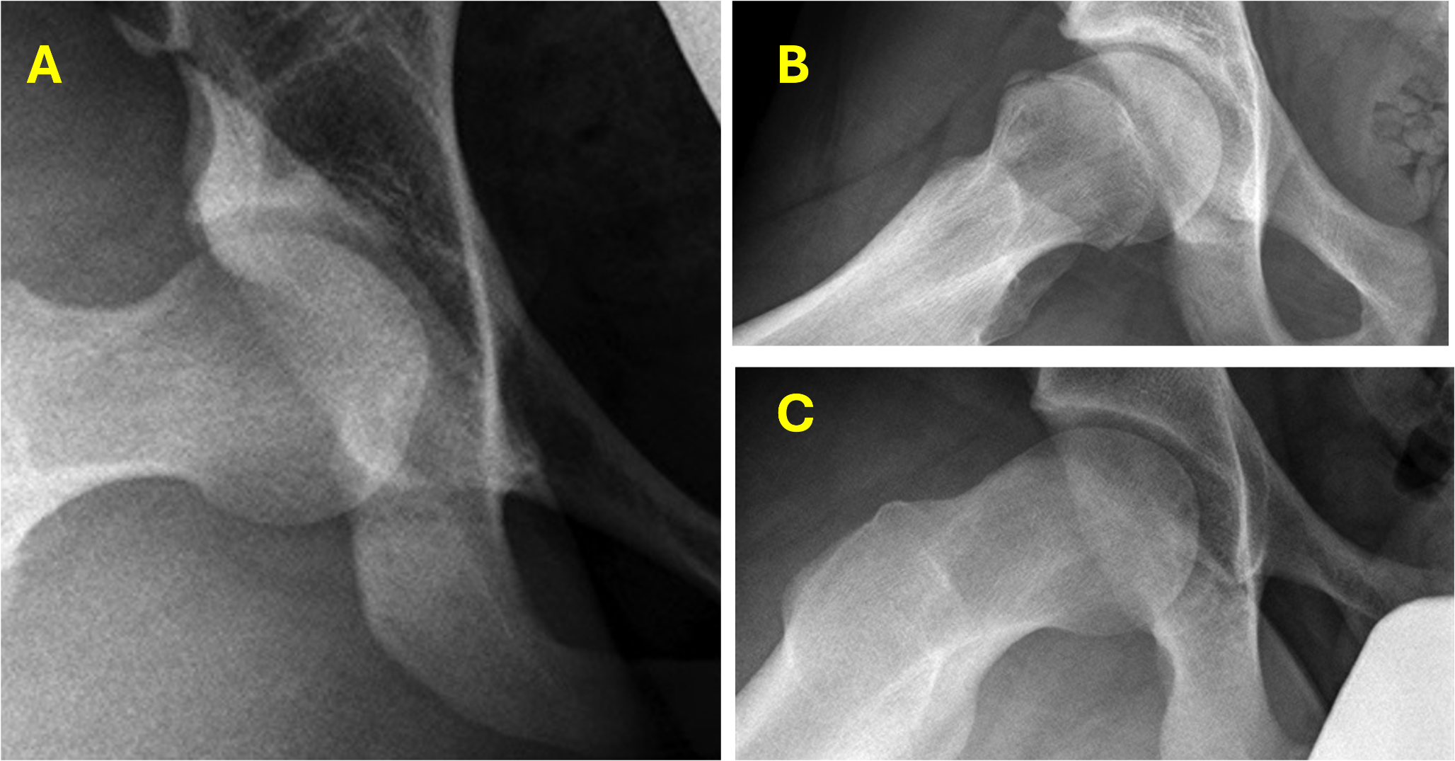 The radiographic images demonstrate three distinct hip presentations. (A) normal hip morphology without symptoms, (B) a symptomatic hip displaying noninflammatory cam changes, and (C) a hip exhibiting the characteristic inflammatory beak formation of the cam deformity, which is frequently observed in patients with underlying inflammatory conditions [12]