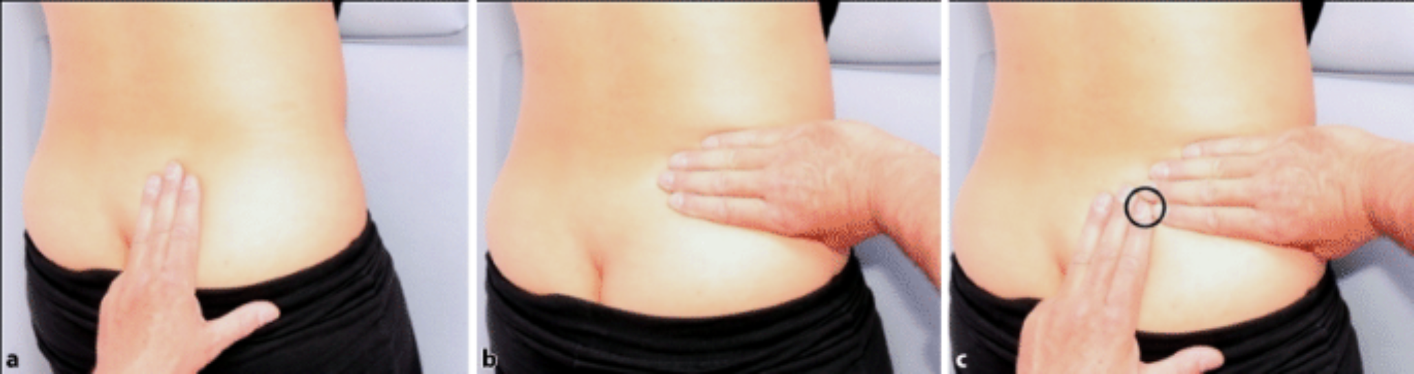 Clinical examination demonstrating the sacroiliac joint pain provocation test (a) initial hand placement on ASIS, (b) posterior pressure application, and (c) target area for pain provocation (black circle) [39]