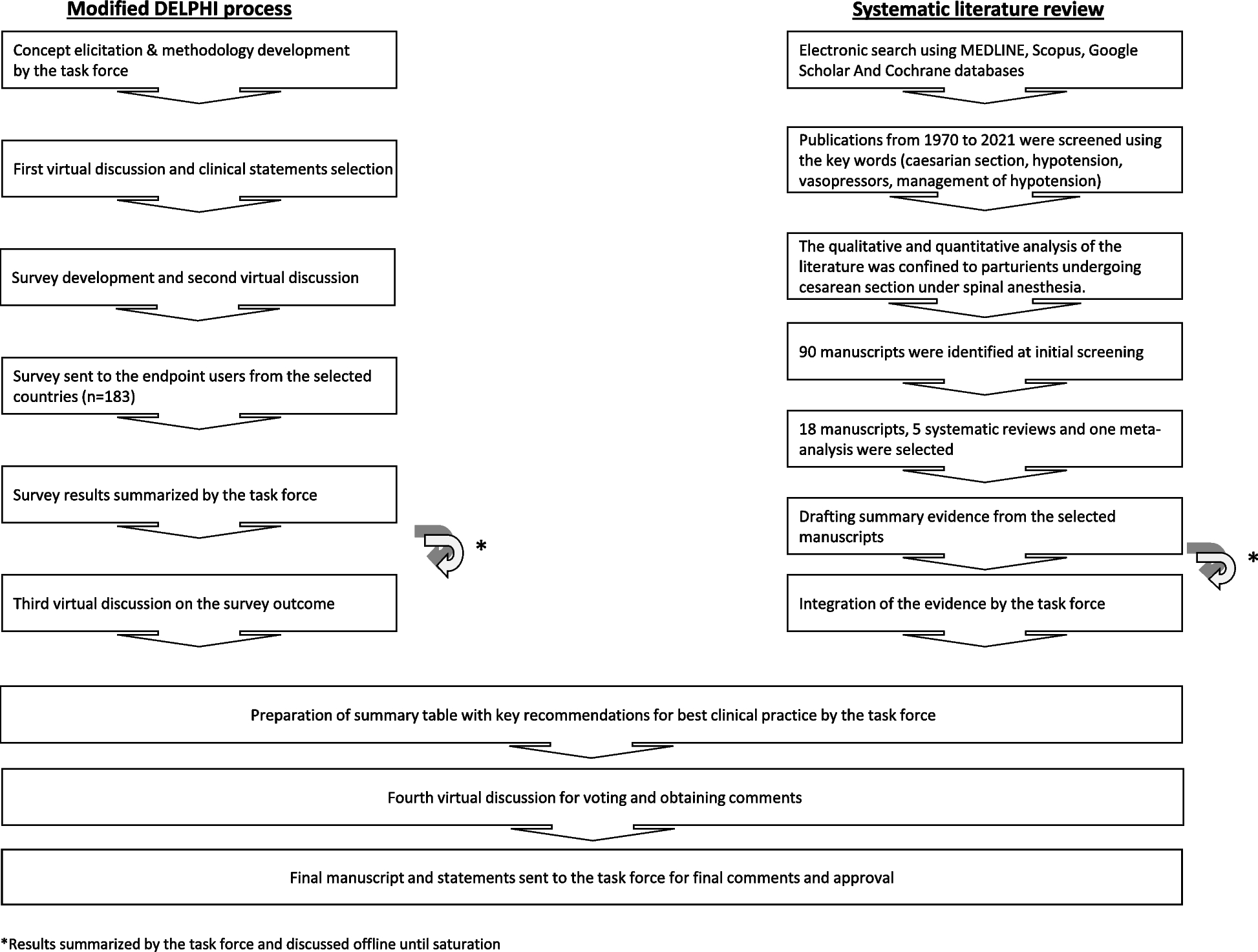 A team of five anesthesiology experts from the Philippines, Vietnam, and Thailand were selected, based on their expertise assessed using a pedigree analysis, to define the relevant clinical questions, search for literature-based evidence, evaluate the available guidelines, and contextualize the recommendations for Southeast Asian (SEA) conditions. Furthermore, they compared the adapted guidelines with real-world practice through a survey shared with a representative panel of local practitioners to collect opinions, identify conflicting views, and determine best practices for the management of hypotension with vasopressors during cesarean section under SA based on current knowledge, evidence, and available treatments.