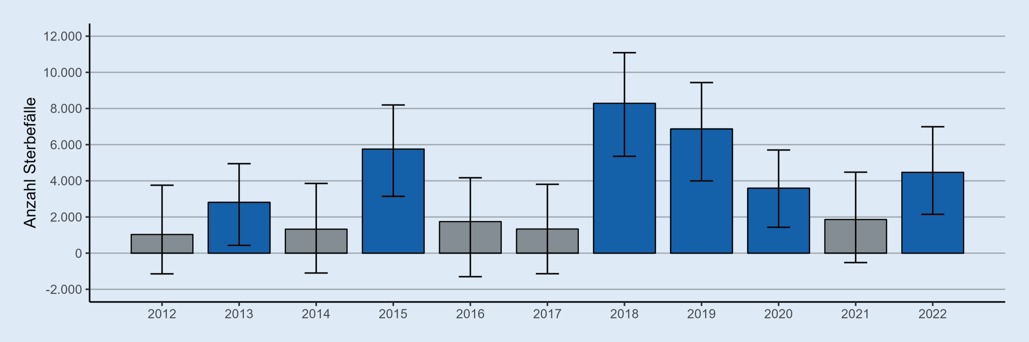 Schätzung hitzebedingter Sterbefallzahlen mittels Exzessmortalität in Deutschland für die Jahre 2012 bis 2022. Jahre mit einer signifikanten Anzahl hitzebedingter Sterbefälle (Untergrenze des 95 %-Prädiktionsintervalls ist größer 0) sind dunkelblau hervorgehoben. (Quelle [37])