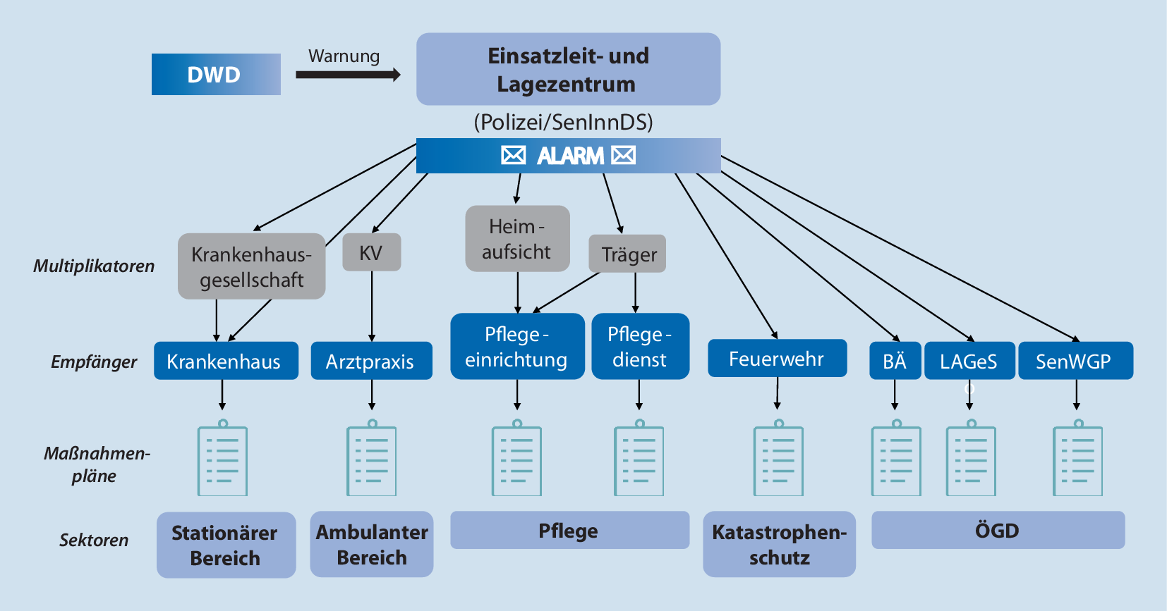 Ein Beispiel dafür, wie sich das Gesundheitswesen aufstellen kann, zeigt das „Aktionsbündnis Hitzeschutz Berlin“. In dem im März 2022 gegründeten Netzwerk arbeiten Ärzt:innenschaft, Pflege, Katastrophenschutz, Rettungsdienste sowie der Öffentliche Gesundheitsdienst zusammen, um zum Schutz vulnerabler Bevölkerungsgruppen in akuten Hitzesituationen beizutragen. So wurde im Sommer 2022 eine Warnkette für anstehende Hitzeereignisse implementiert (Abb. 4), Musterhitzeschutzpläne für Gesundheitseinrichtungen mit beispielhaften Hitzeschutzmaßnahmen wurden erstellt und Informations- und Schulungsmaterialien entwickelt (s. Infobox). Über den Sommer haben die Akteur:innen des Bündnisses das Thema eigenverantwortlich in ihren Aufgabenbereichen platziert und umgesetzt.