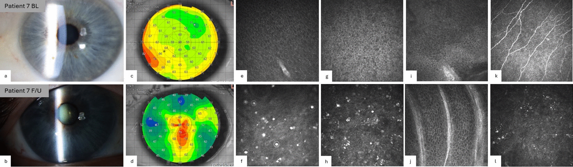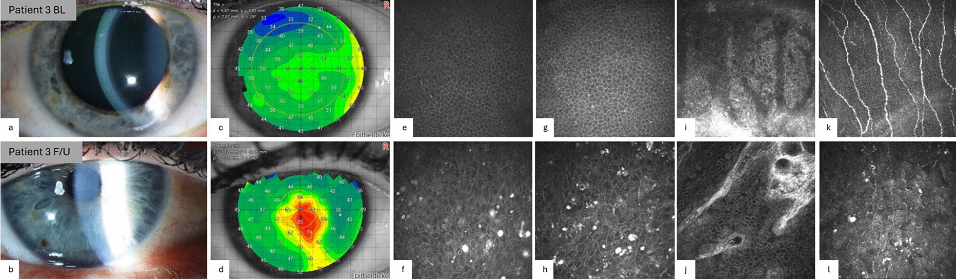 Corneal changes BL (top row) compared to F/U (bottom row) in patient number 7: a, b slit lamp photography; c, d MS-39 epithelial thickness mapping; e–l confocal microscopy of the different layers of the cornea. a Translucent, clear cornea; b slit lamp photograph of microcystic changes of the epithelium; c regular, homogenous epithelial thickness map; d irregular changes of the epithelial thickness measured with the MS-39 device. Red area highlights a thickening, especially centrally at the corneal apex, diminishing towards the periphery; e, g physiologic superficial and basal epithelial layers; f, h microcystic keratopathy in individual layers of the epithelium depicted by CCM: hyperreflective cyst-like structures in the superficial epithelium (f) and grape-like small hyperreflective structures in the basal epithelium (h); i, j healthy limbal structures with healthy palisades of Vogt at baseline and follow-up showing no sign of toxicity caused by therapy; k physiologic corneal subbasal nerve structures; l complete loss of subbasal nerve structures compared to baseline (k)