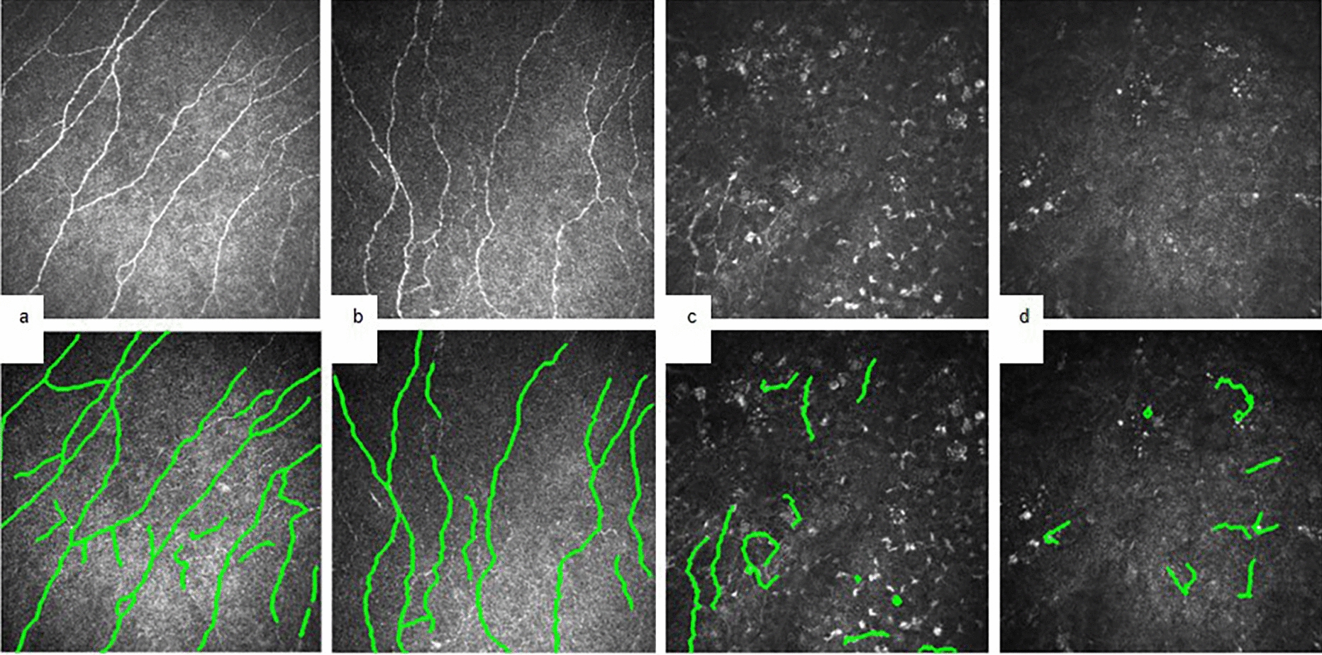 Changes of the subbasal nerval plexus (SNP) over the course of three Belantamab cycles (a baseline examination, b after first infusion, c after second infusion, d after third infusion). Top row depicts the SNP layer imaged with confocal microscopy; bottom row shows the analysis with automated ACCMetrics software: detected nerve fibers presented in green; b severe nerve fiber thinning and fragmentation; c, d “false” detection of nerves; only residual inflammatory cells are visible