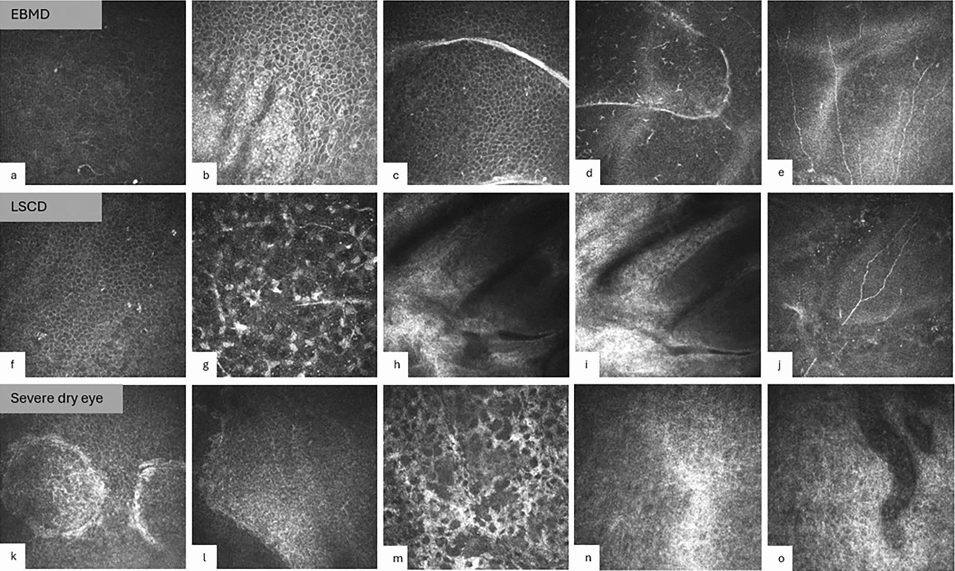 Exemplary images of corneal confocal microscopy in the substudy population. a–e Patient with epithelial basement membrane dystrophy: a small cysts within the epithelium; b basal epithelial cells are highly distorted and show changes in the cytoplasm and reflective nuclei; c, d abnormal basement membrane extending into the epithelium shown by highly reflective tissue within the intermediate and basal epithelial layer [23‐25], e normal configuration of the subbasal nerves. f‐j Patient with limbus stem cell deficiency (LSCD), f single, distorted, hyperreflective epithelial cells with bright nuclei; g healthy stroma with keratocytes and stromal nerves [26]; h, i reduced cellular reflectivity in the transitional zone of limbus and cornea, j subbasal-nerve plexus detectable. k–o Patient with severe dry eye disease: k, l highly distorted epithelium and scarring into the deeper layers and stroma (m) after multiple erosions and ulcera, there was no detection of nerve fibers; n, o conjunctivalized limbal area