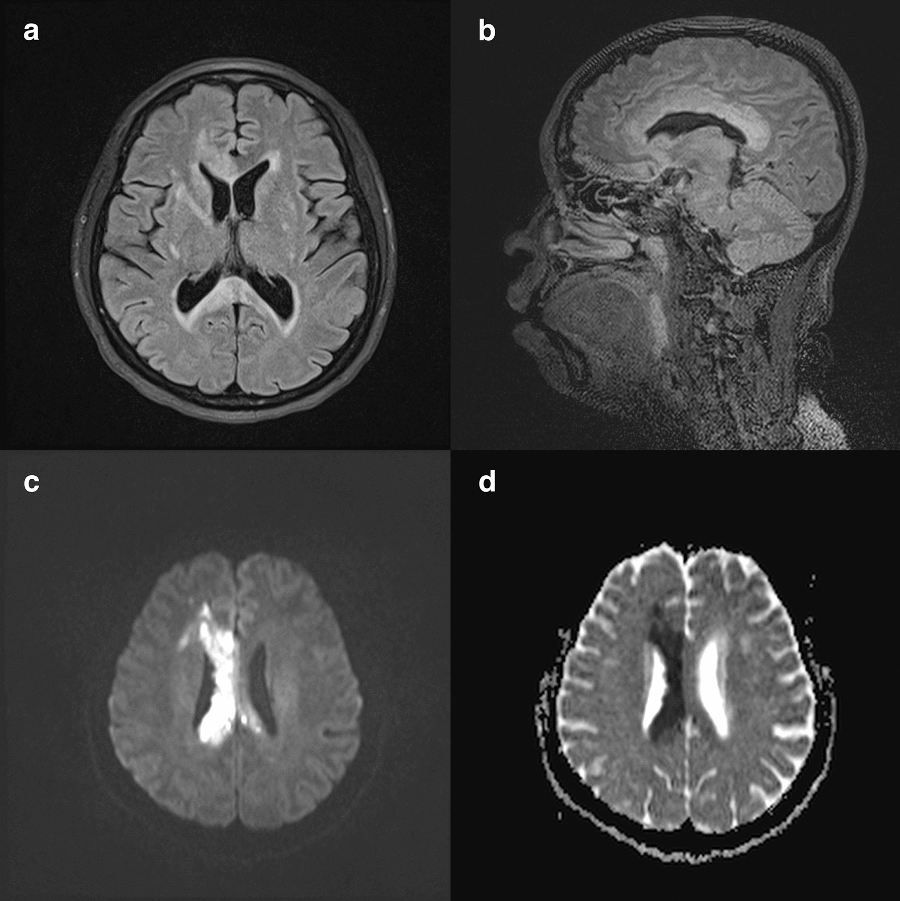 MRI of the brain showed hyperintense signals in the corpus callosum, especially the splenium and appearing as an “arch-bridge” pattern on T2/FLAIR sequences. a, b There were also hyperintense lesions in the corona radiata and putamen suggestive of old lacunar infarctions. On the DWI/ADC sequences, the entire corpus callosum showed significant restricted diffusion particularly on the right side (c, d)