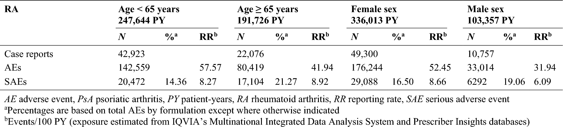 In Table 5 of this article, the frequencies (%) for serious adverse events (SAEs) within the rheumatoid arthritis (RA) section for the age ≥ 65 years, female sex, and male sex patient subgroups were published with incorrect values of 77.48, 59.00, and 58.49, respectively. The correct values are 21.27, 16.50, and 19.06, respectively. The first three rows of the ‘RA’ section from the corrected table 5 are provided below.