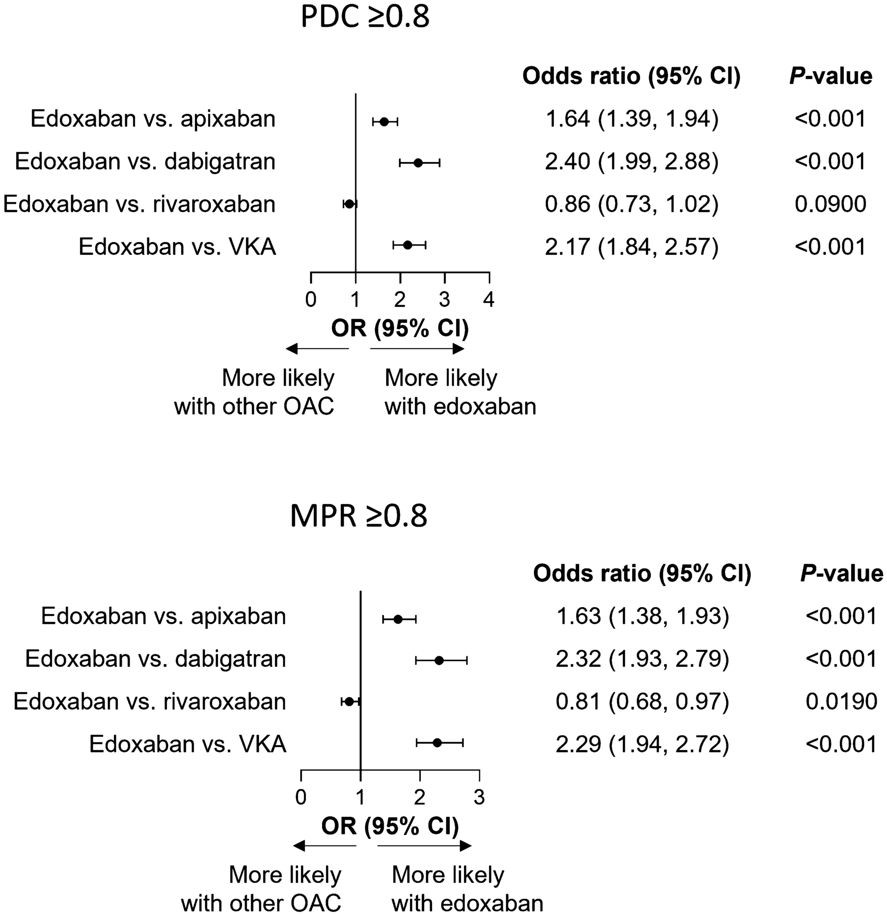 Odds ratios for adherence outcomes after matching. CI confidence interval, MPR medication possession ratio, OAC oral anticoagulant, OR odds ratio, PDC proportion of days covered, VKA vitamin K antagonist