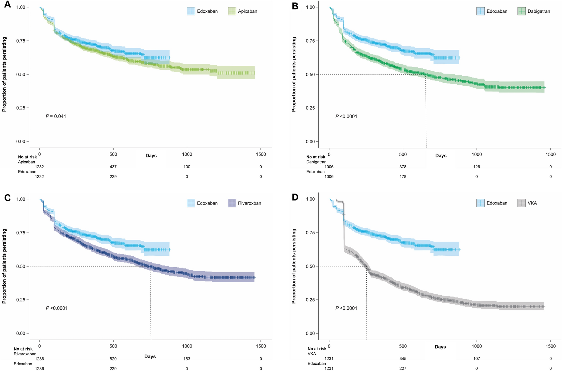 Kaplan–Meier curves of time to discontinuation of index therapy after matching for a edoxaban and apixaban, b edoxaban and dabigatran, c edoxaban and rivaroxaban, and d edoxaban and VKA. No number, VKA vitamin K antagonist