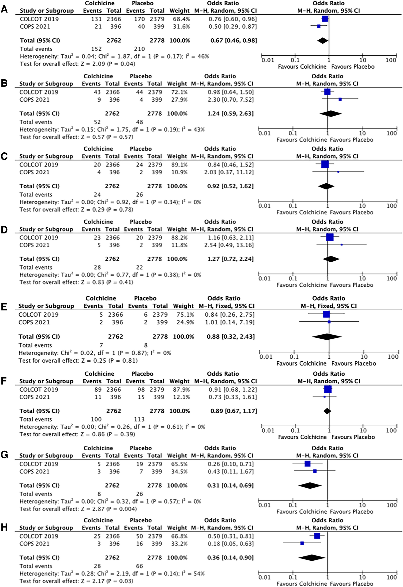 Clinical outcomes. Forest plot displaying summary odds ratio (OR) and 95% confidence interval (CI) for A study composite primary endpoint, B all-cause death, C cardiovascular death, D non-cardiovascular death, E resuscitated cardiac arrest, F myocardial infarction, G cerebrovascular accident, and H repeat evascularization