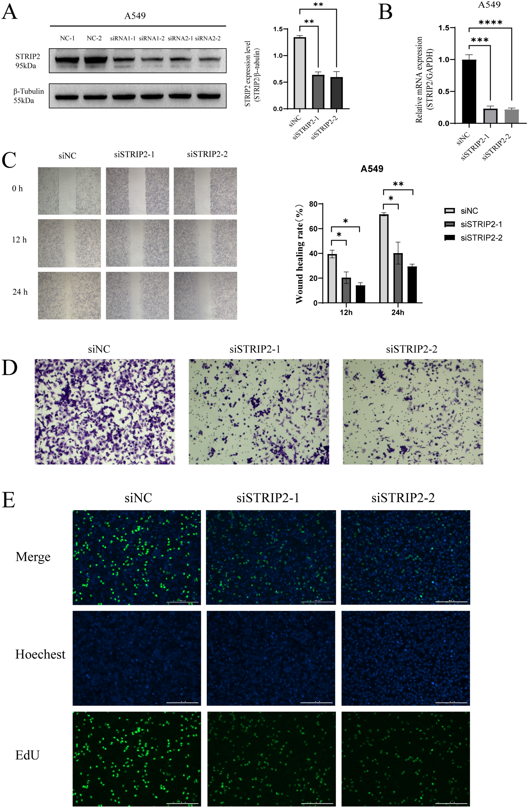 To verify the function of STRIP2 in LUAD progression. A Western blot demonstrating the knockdown efficiency of siRNA. B qRT-PCR of STRIP2 levels in response to siRNA transfection. C The migration ability of A549 cells after STRIP2 knockdown was detected by scratch assay. D The invasion ability of A549 cells after STRIP2 knockdown was detected by Transwell assay. E The proliferation ability of A549 cells after STRIP2 knockdown was detected by Edu assay. *p < 0.05, **p < 0.01, ***p < 0.001, asterisks (*) stand for significance levels