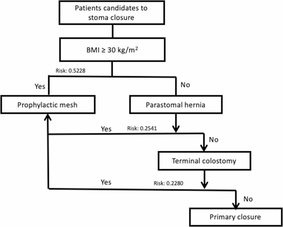 The main outcome of the study was the absence of incisional hernia. A decision tree was performed comparing the incidence of incisional hernia in low-risk and high-risk patients, and in high-risk patients who did and did not undergo prophylactic mesh placement. The parameters were based on the probability of developing incisional hernia after stoma closure estimated from two systematic reviews and meta-analyses that evaluated risk factors and the effectiveness of prophylactic mesh.