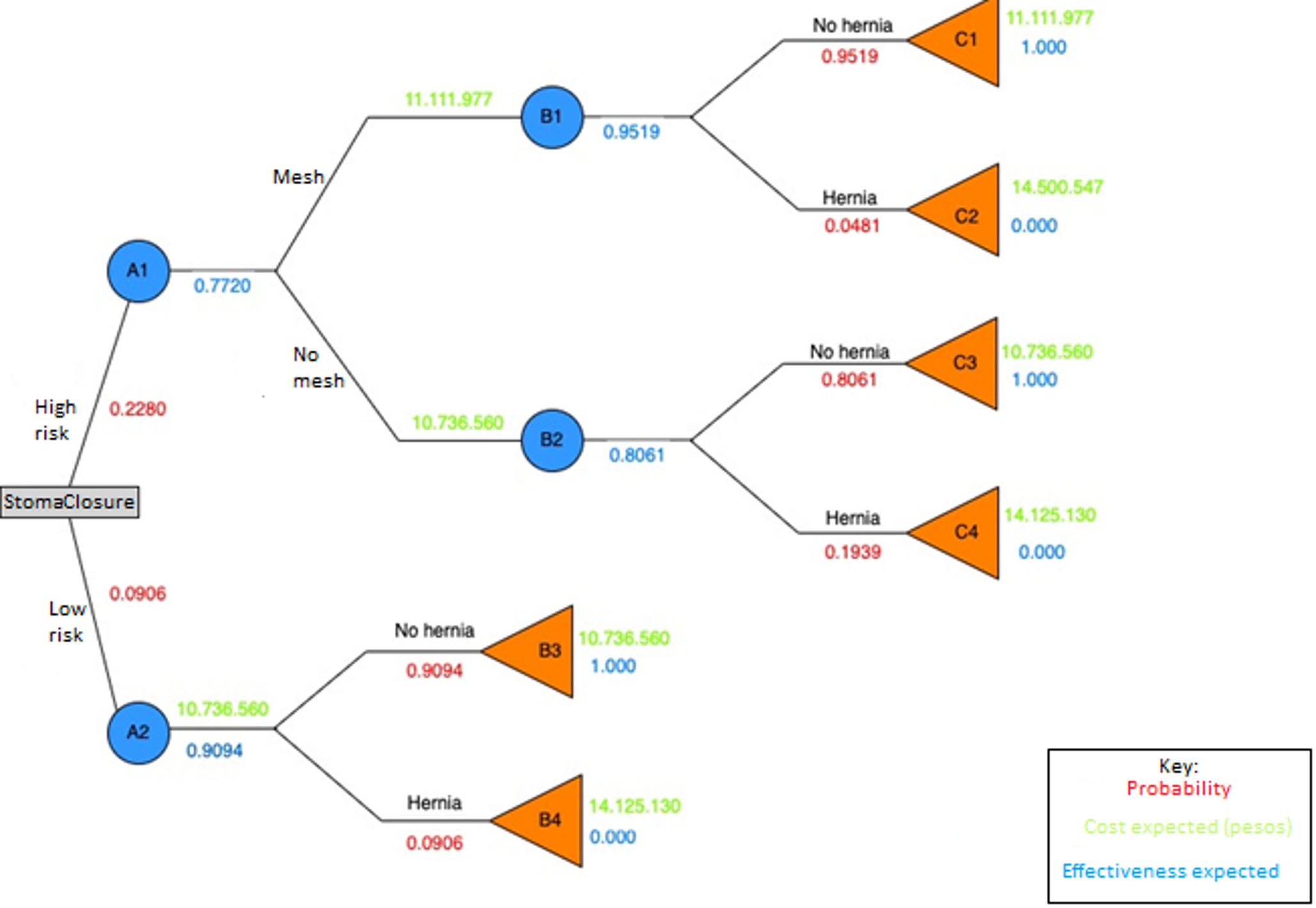 The average cost in case of performing the strategy of treating all patients with prophylactic mesh would be 11.273.747 Colombian pesos with an effectiveness of 0.9522, the strategy of only treating high-risk patients with prophylactic mesh would be of 11.163.614 Colombian pesos with an effectiveness of 0.9290 and the strategy of not placing prophylactic mesh would be 10.736.560 Colombian pesos with an effectiveness of 0.8061 (Table 1).
