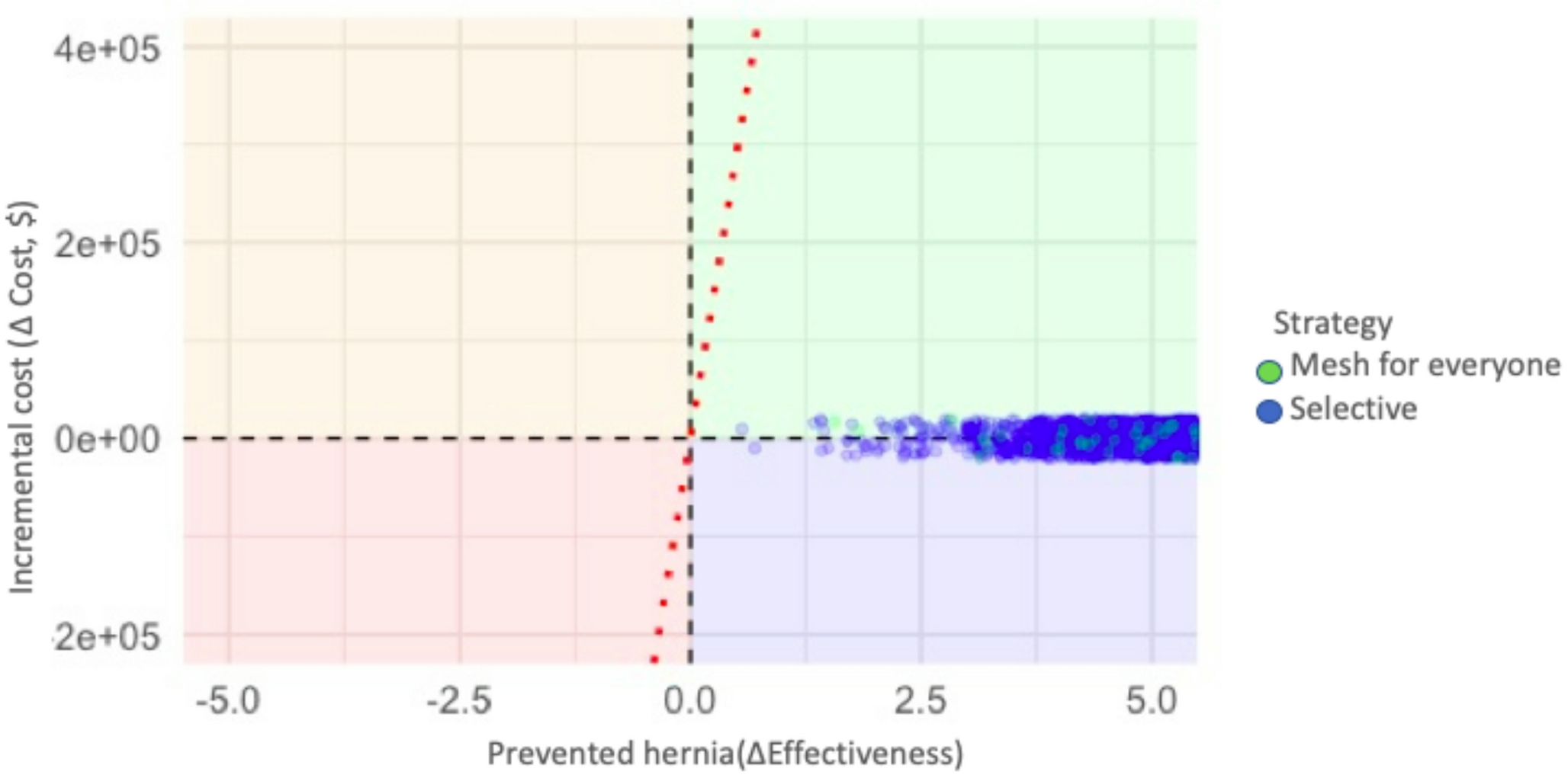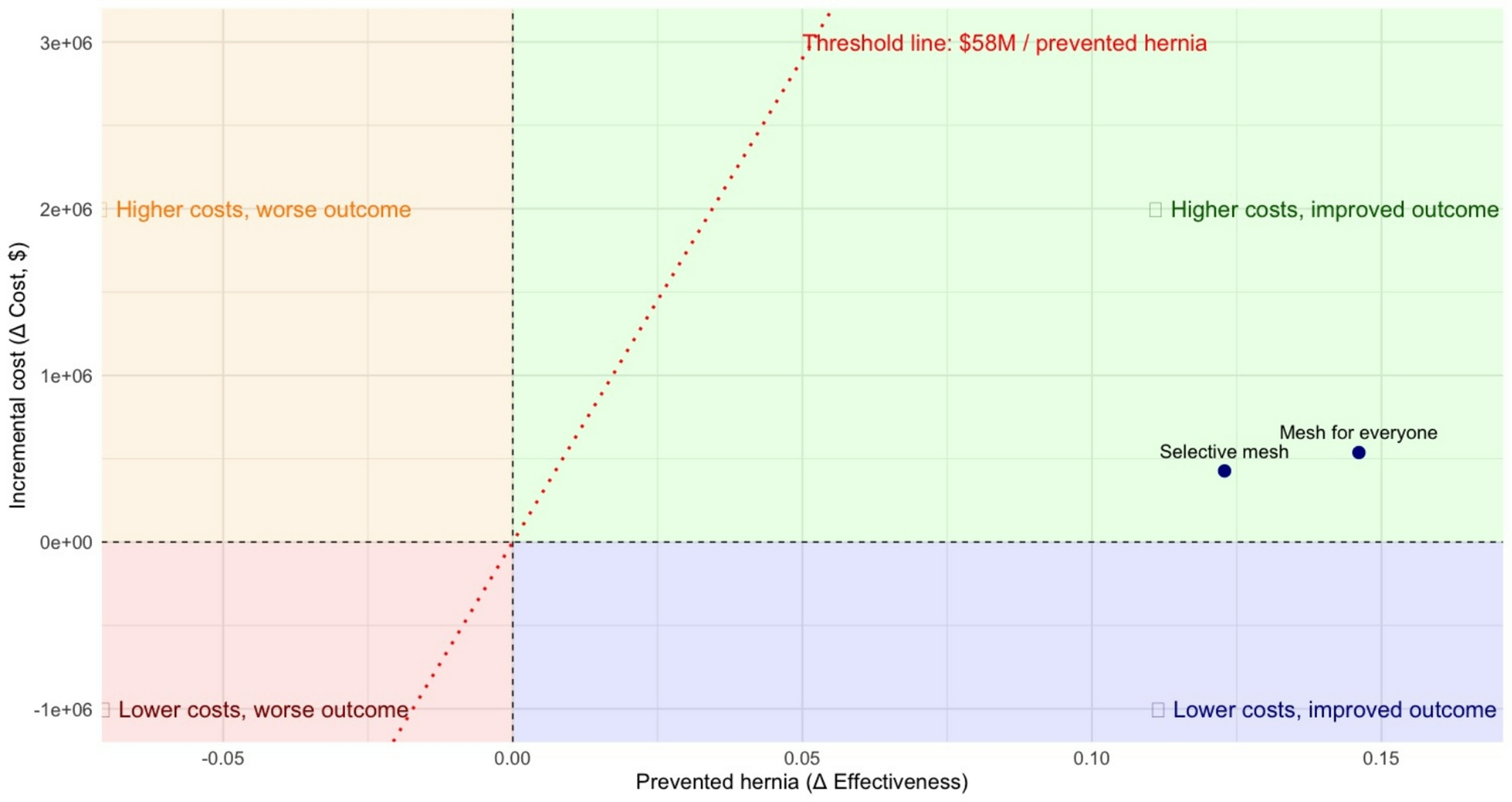 Cost-effectiveness plane of prophylactic mesh use for everyone versus selective prophylactic mesh
