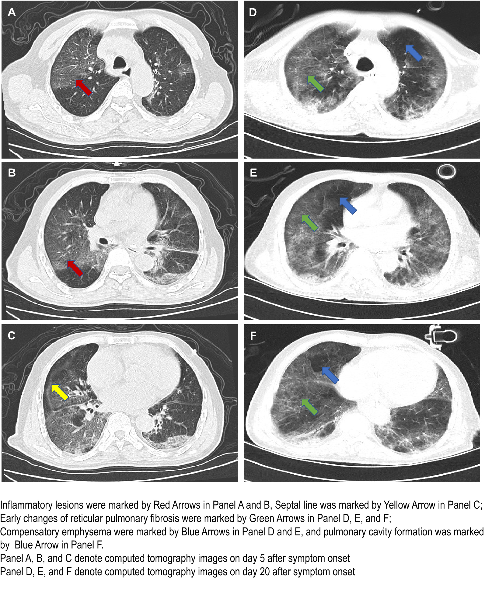 We recently reported in Intensive Care Medicine the imaging changes of acute stage from a case of 75-year-old male patient with severe COVID-19 pneumonia combined acute respiratory distress syndrome (ARDS), septic shock, and multiple organ disfunction syndrome (MODS) who had a history of 10-year hypertension and 1-year diabetes. He presently received advanced life support treatment including respiratory support (invasive mechanical ventilation) and circulatory support (vasoconstrictor assistance), as well as intermittent renal replacement therapy (IRRT) in intensive care unit (ICU) of our hospital—a tertiary teaching hospital of medical university. Because his MODS still existed on the day 20 after symptom onset, we had to re-examine the chest computed tomographic (CT). The results showed that early changes of reticular pulmonary fibrosis appeared in Panels D, E, and F (marked by green arrows), compensatory emphysema occurred in Panels D and E (marked by blue arrows), and pulmonary cavity formation appeared in Panel F (marked by blue arrows), compared with acute stage of the day 5 after symptom onset, inflammatory lesions and ground glass shadow of Panels A and B (marked by red arrows), as well as septal line of Panel C (marked by yellow arrows). Presently, this patient is still under the condition of advanced life support therapy (Fig. 1).