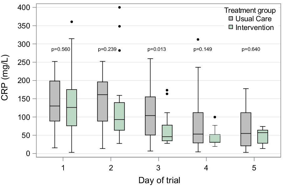 Of 41 patients enrolled, 19 were randomized to the intervention arm and 22 to the usual care arm. No significant differences were observed between groups with regards to age, sex, comorbidities, and oxygen delivery devices (see Table 1). Study treatment protocol was followed in 18 (95%) patients in the intervention arm. In the intention to treat analysis the intervention arm had more oxygen-free days (23.5 (21, 25) versus 21 (17, 25), p = 0.033) and hospital-free days (21 (18, 22) versus 18.5 (15, 21), p = 0.05) than the usual care arm. Daily distribution of CRP in both arms revealed significantly lower CRP levels on day 3 in the intervention arm compared to the usual care arm (see Fig. 1).