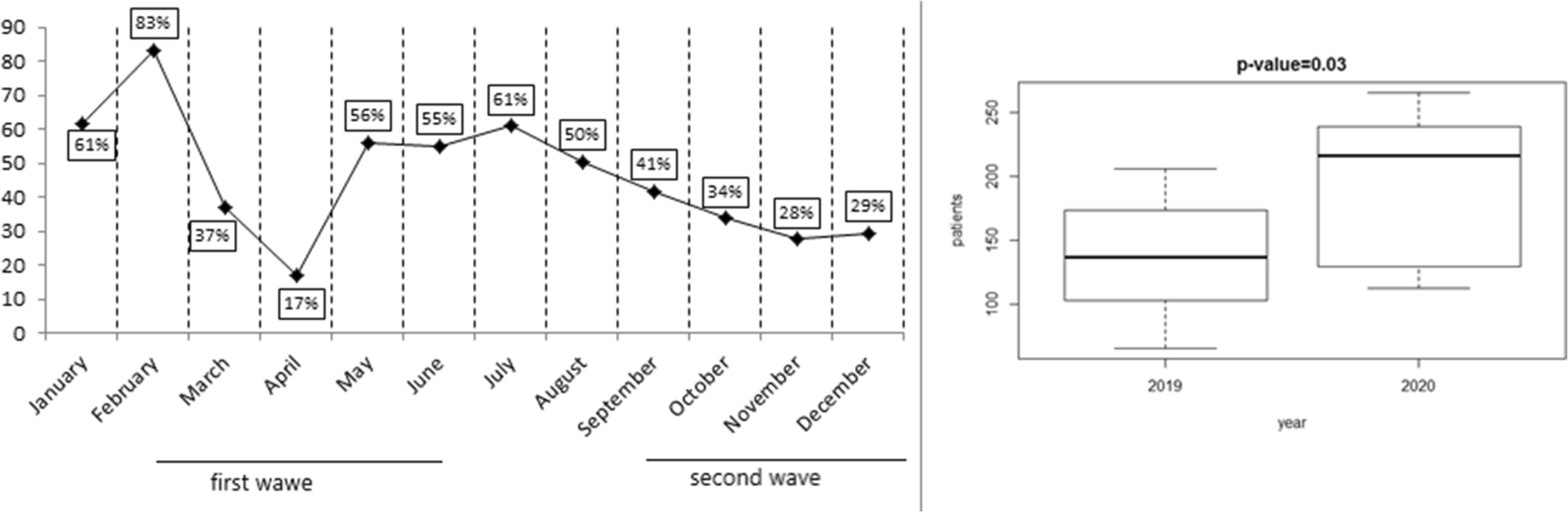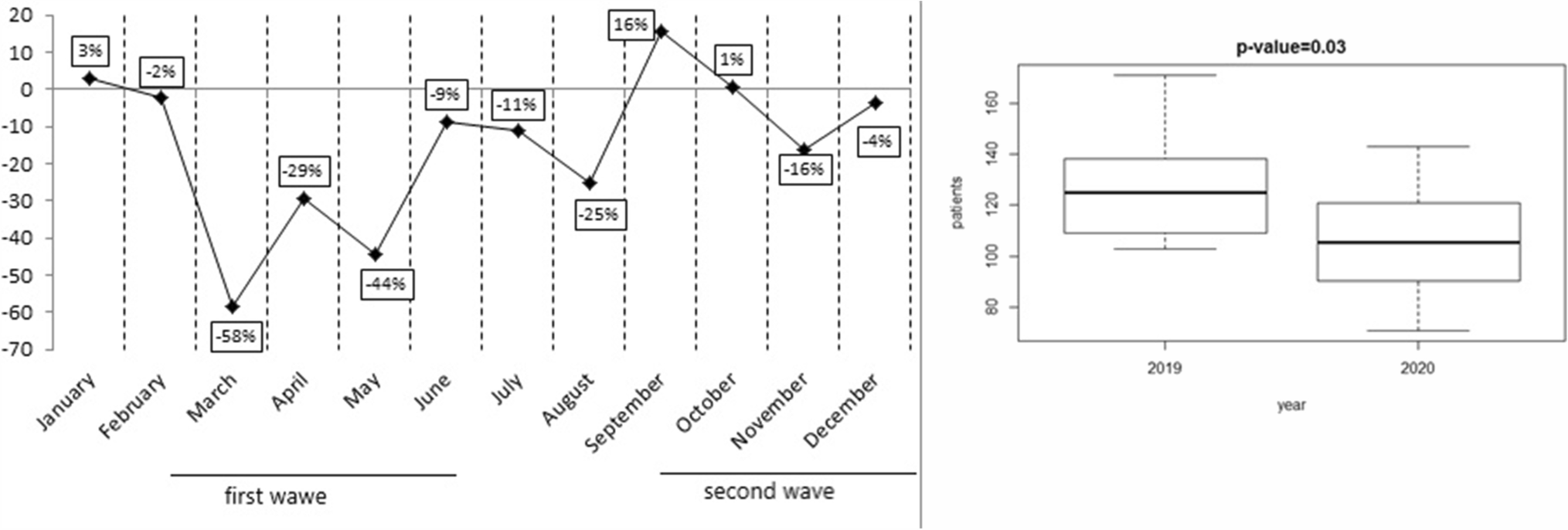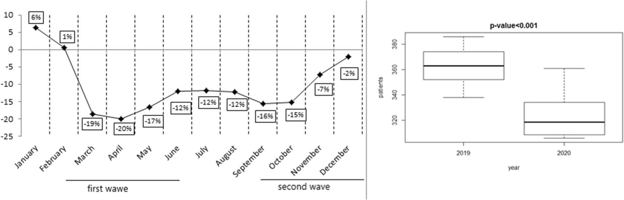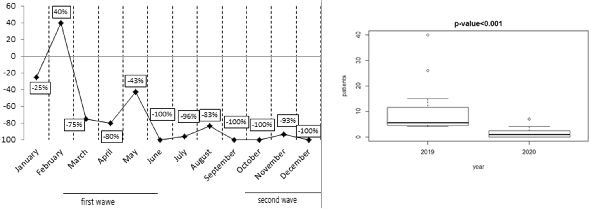 16]. In our district, one of the territorial units of the Piacenza’s hospital became the first Italian hospital devoted entirely to COVID-19; however, there were so many patients affected with SARS-COV-2 infection that they were admitted to all hospitals and private clinics in the city of Piacenza and the surrounding province. Consequently, patients with other diseases found it difficult to visit hospitals and attend examinations. These included oncologic patients who, above all, were unable to receive surgical treatment, since medical oncology continued through oncologic therapy. In addition, patients would visit the hospital less frequently to avoid being infected by SARS-COV-2. Compared to the first wave, the second was less severe in Piacenza, and the number of deaths and hospitalizations was not comparable (approximately 15% of hospital’s beds in the second wave were taken up by COVID-19 patients, versus 95% of the beds during the first wave).