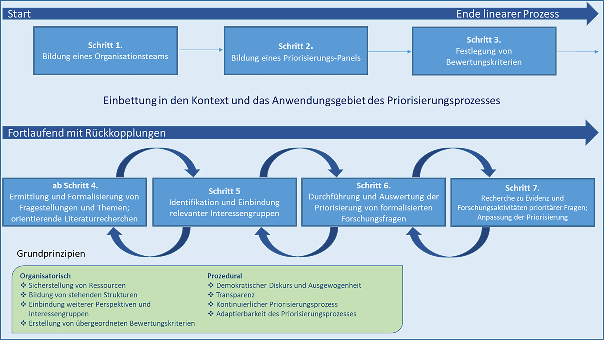 In dem adaptierbaren Konzept werden zunächst organisatorische und prozedurale Grundprinzipien für einen gelingenden Priorisierungsprozess aufgeführt. Bei der Umsetzung des vorgeschlagenen 7‑schrittigen Prozesses der Priorisierung sollten diese allgemeinen Prinzipien bestmöglich eingehalten werden (Abb. 1).