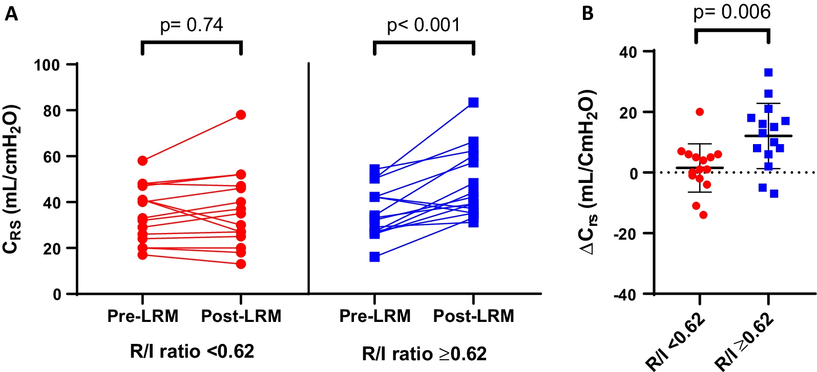 rs was predictable in patients with R/I ratio above 0.8 (25% of the study population). These very selected patients with very high lung recruitability based on R/I ratio (> 0.8) might benefit from LRM. Altogether, these results support an individual used of LRM based on R/I ratio and a confirmation in larger studies is needed.