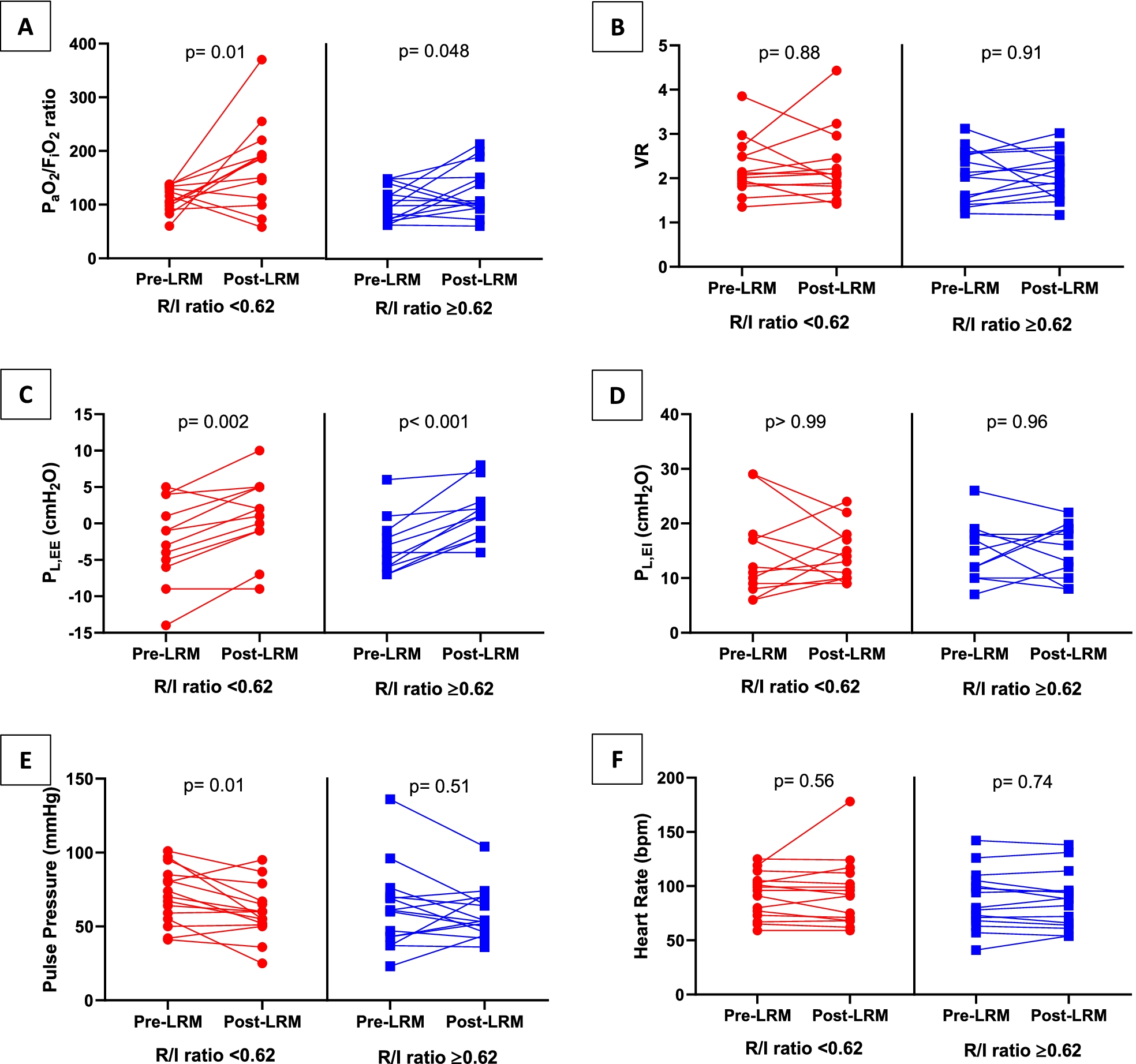 2 ratio during the LRM in patients with low lung recruitability and in those with high lung recruitability (especially when we focused on patients with positive P