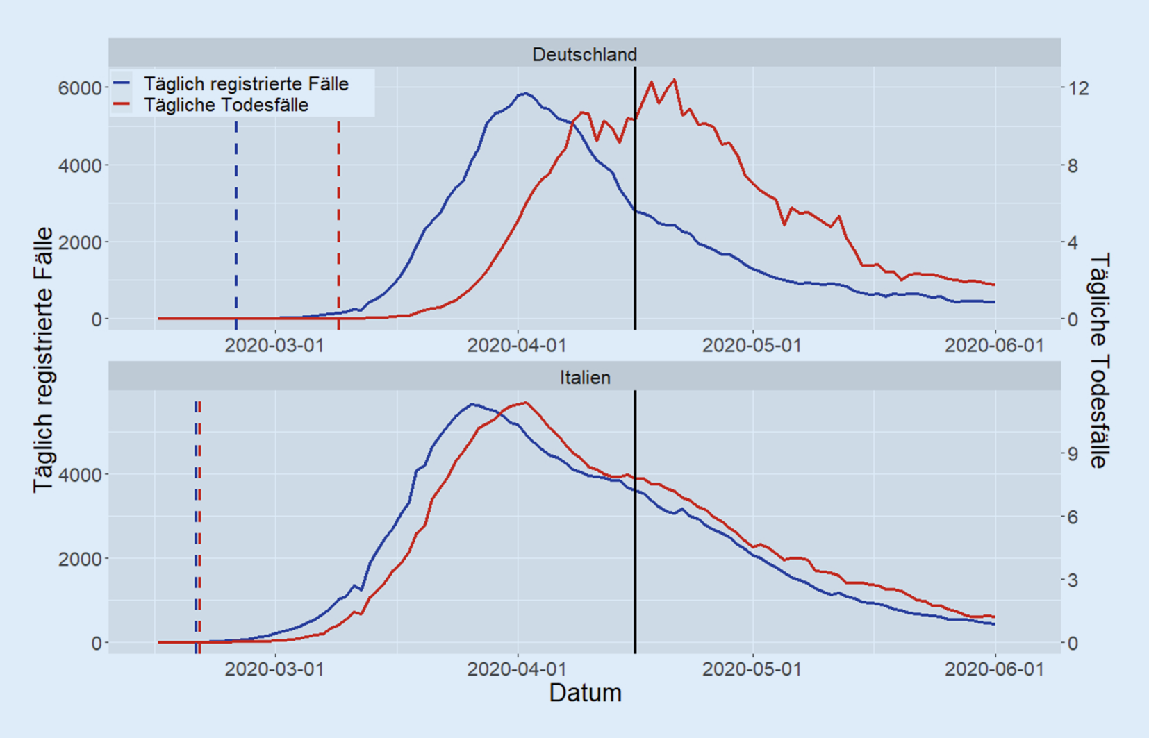 Unsere Motivation, das Modell zu entwickeln, war die Hypothese, dass sich die Dunkelziffern zwischen den Ländern in der Frühphase einer Pandemie stark voneinander unterscheiden. Wir zeigen das für COVID-19 durch einen Vergleich der Länder Deutschland und Italien, die sich als gute Modellländer erweisen. Diese Hypothese möchten wir im Folgenden durch 2 Sachverhalte erläutern.