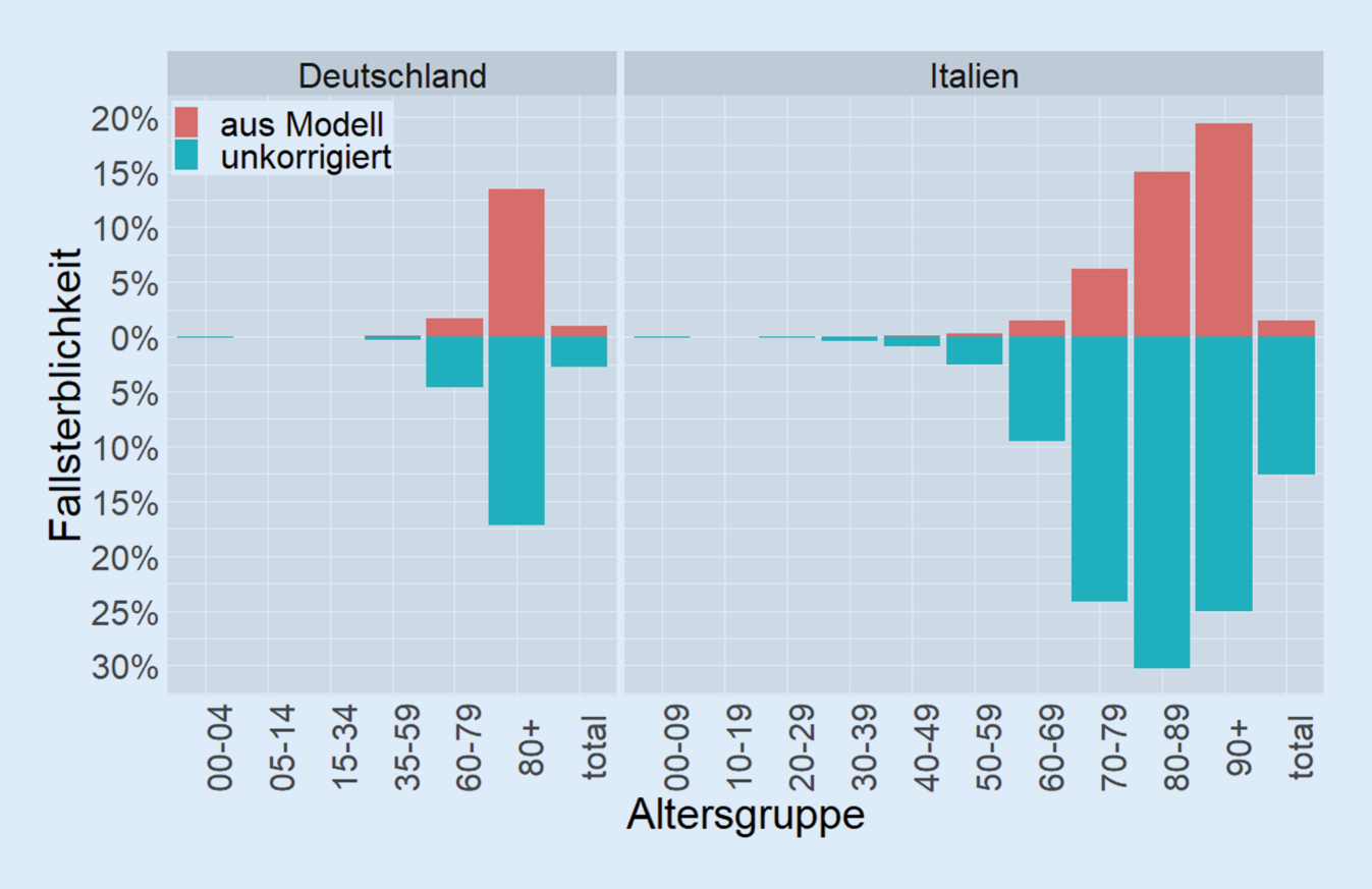 Die deutlich größere Dunkelziffer in Italien geht in unserem Modell direkt auf die Tatsache zurück, dass der Anteil an sehr alten Menschen bei den Erkrankten viel höher ist als deren Anteil an der Bevölkerung. Wir halten es für sehr plausibel, dass dies auf die Tatsache zurückzuführen ist, dass ältere Menschen im Mittel viel schwerer erkranken und damit deutlich stärker auffallen als jüngere Menschen. Diese Dunkelzifferschätzungen ermöglichen es uns, einen großen Teil des Unterschieds in den zum 16.04.2020 beobachteten Fallsterblichkeiten für Italien und Deutschland zu erklären. Der resultierende Faktor von 1,5 zwischen den Fallsterblichkeiten erscheint uns plausibler als der deutlich höhere Faktor von 4,6, der rein aus den gemeldeten Fallsterblichkeiten bestimmt wird. Die verbliebene Abweichung vom Faktor 1 lässt sich durch weitere Faktoren (wie bspw. ein lokal stark überlastetes Gesundheitssystem) erklären, die nur schwierig quantitativ zu ermitteln sind. Darüber hinaus ist die mit unserem Modell geschätzte Fallsterblichkeit für Italien monoton mit dem Lebensalter steigend, sodass die Altersgruppe 90+ das höchste Risiko aufweist, an der Krankheit zu versterben. Dies erscheint uns auch glaubwürdiger als die unkorrigierte Schätzung der Fallsterblichkeiten aus den registrierten Fallzahlen, in denen die zweithöchste Altersgruppe (80–89 Jahre) eine höhere Fallsterblichkeit aufweist als die höchste (90 Jahre und älter).