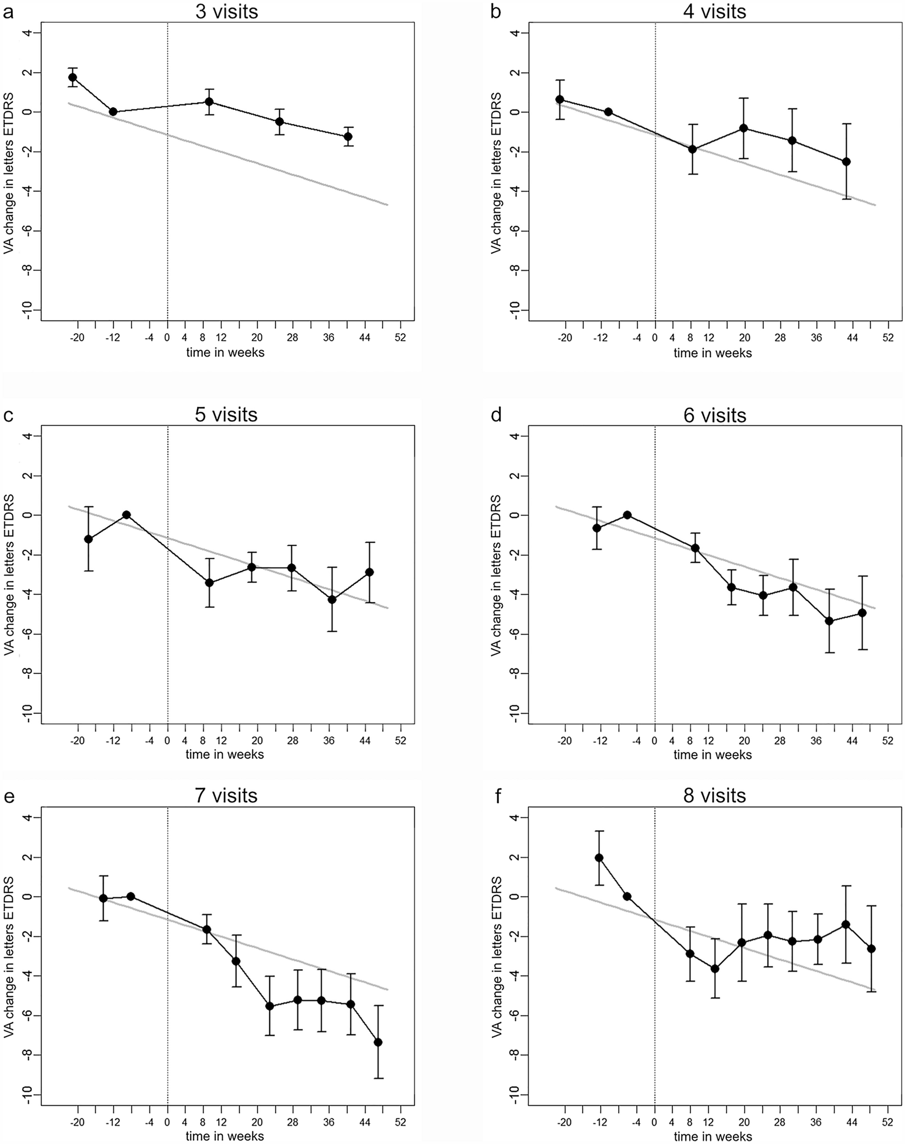 Mean visual acuity (VA) change in Early Treatment Diabetic Retinopathy Study (ETDRS) letters of all patients (gray line) and separated into subgroups (a–f) according to the number of visits over time in weeks. The vertical dashed line illustrates the mean planned interval, which was postponed during the coronavirus disease 2019 (COVID-19) pandemic and its associated governmental lockdown. The VA change including standard error (vertical lines) of each subgroup for the penultimate and the last visit with its respective average time interval before the lockdown are compare to the VA change at each visit after restarting treatment over the course of 1 year