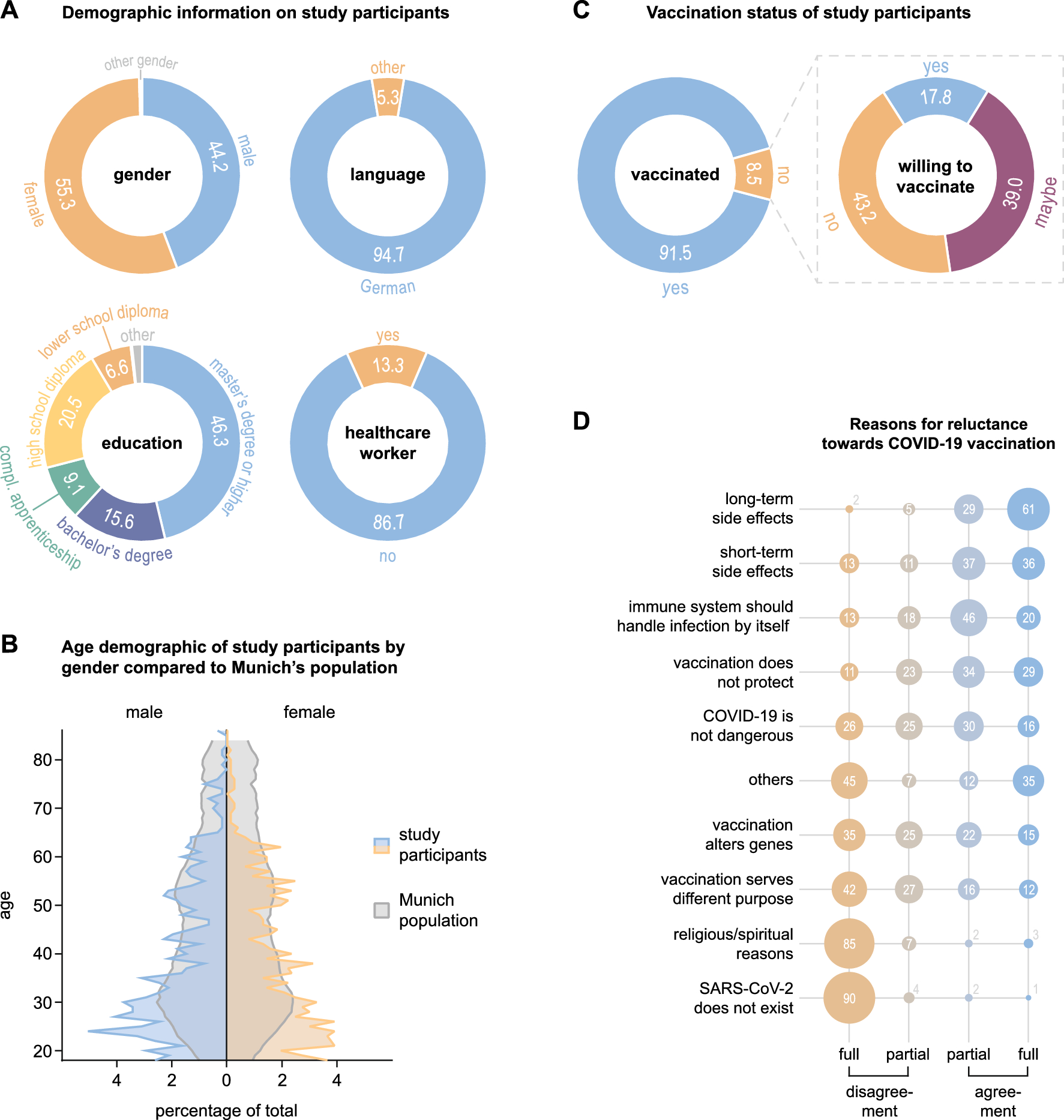 Overview of the study population. A Demographic information on the study participants. Information is shown as percentage of all 1388 participants. B Age demographic of study participants by gender (blue and orange shaded) compared to Munich’s population in 2021 (gray shaded) [19]. C Percentage of COVID-19-vaccinated individuals among all participants (left) and percentages of non-vaccinated individuals willing to vaccinate (right). D Agreement and disagreement (partial or full) to different reasons for reluctance towards vaccination among those 97 participants indicating to be not or maybe willing to get vaccinated. Absolute numbers of participants giving certain answers are displayed