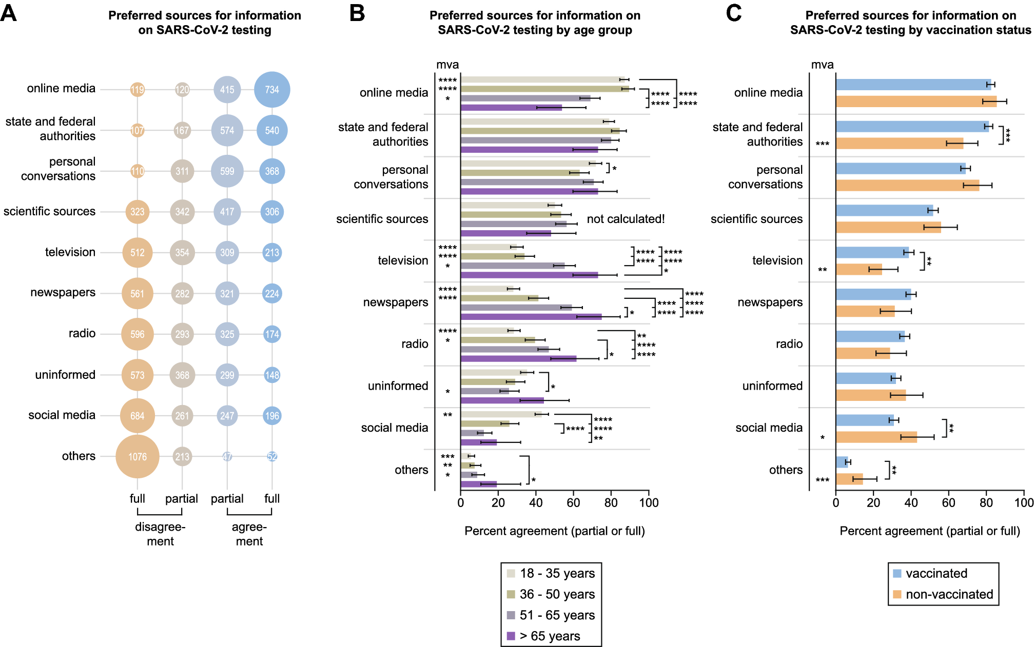 Information sources for SARS-CoV-2 testing. A Agreement and disagreement (partial or full) on preferring different information sources for SARS-CoV-2 testing among all 1388 participants. Absolute numbers of participants giving certain answers are displayed. B, C Percentages of all participants agreeing (partially or fully) on gathering information on testing using different sources by age group (B) and vaccination status (C). Error bars indicate 95% confidence intervals. Asterisks next to brackets indicate statistical significance between groups calculated using Fisher’s exact test (C) or Fisher’s exact test with Holm’s testing correction (B). Asterisks below “mva” indicate statistical significance in multivariate analysis. If no asterisks are given, no statistical significance was detected. mva—multivariate analysis