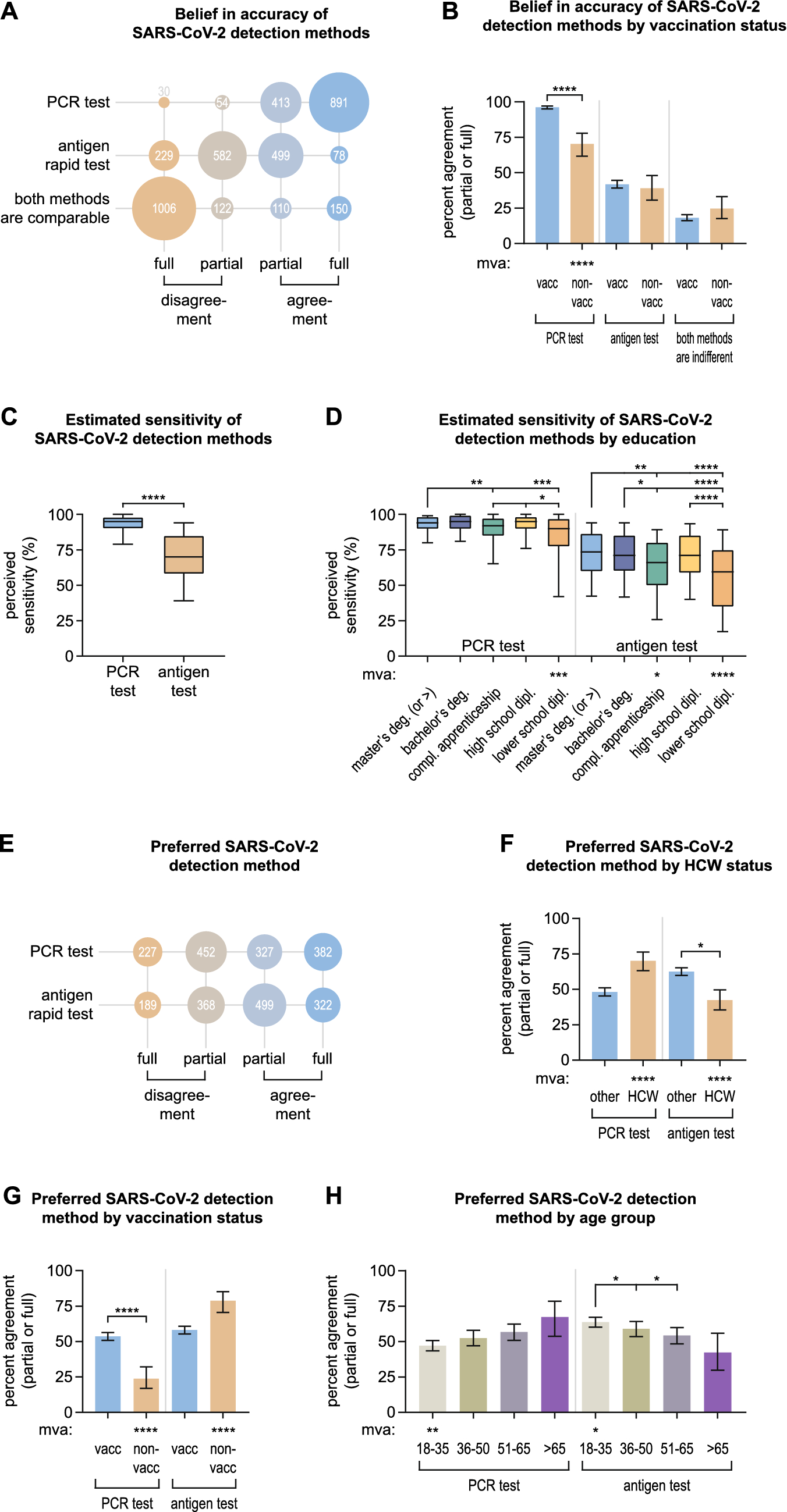 Belief in accuracy and personal preferences comparing different SARS-CoV-2 detection methods. A Agreement and disagreement (partial and full) on believing in the accuracy of the PCR and RAT and the statement of being unaware of differences between the two SARS-CoV-2 detection methods among all 1388 participants. B Percentages of all participants agreeing (partially or fully) on believing in the accuracy of the two testing methods or considering them indifferent by vaccination status. C Comparison of the estimated sensitivities of both testing methods among all participants. D Estimated sensitivities by participants’ highest degree of education. E Agreement and disagreement (partial and full) for preferring the PCR and RAT for COVID-19 testing among all participants. F–H Percentages of all participants agreeing (partially or fully) on preferring either of the two testing methods by healthcare worker status (F), vaccination status (G), and age group (H). Absolute numbers of participants giving certain answers are displayed in (A, E). Error bars in (B, F–H) indicate 95% confidence intervals. Box plots in (C, D) depict medians, bounds between upper and lower quartiles, and whiskers between the 10th and 90th percentiles. Asterisks above brackets indicate statistical significance between groups calculated with Fisher’s exact test (B, F, G), Wilcoxon rank sum test with continuity correction (C, D), and Fisher’s exact test with Holm’s testing correction (H). Asterisks next to “mva” indicate statistical significance in multivariate analysis. If no asterisks are given, no statistical significance was detected. compl.—completed, deg.—degree, dipl.—diploma, HCW—healthcare worker, mva—multivariate analysis, non-vacc—non-vaccinated, vacc—vaccinated