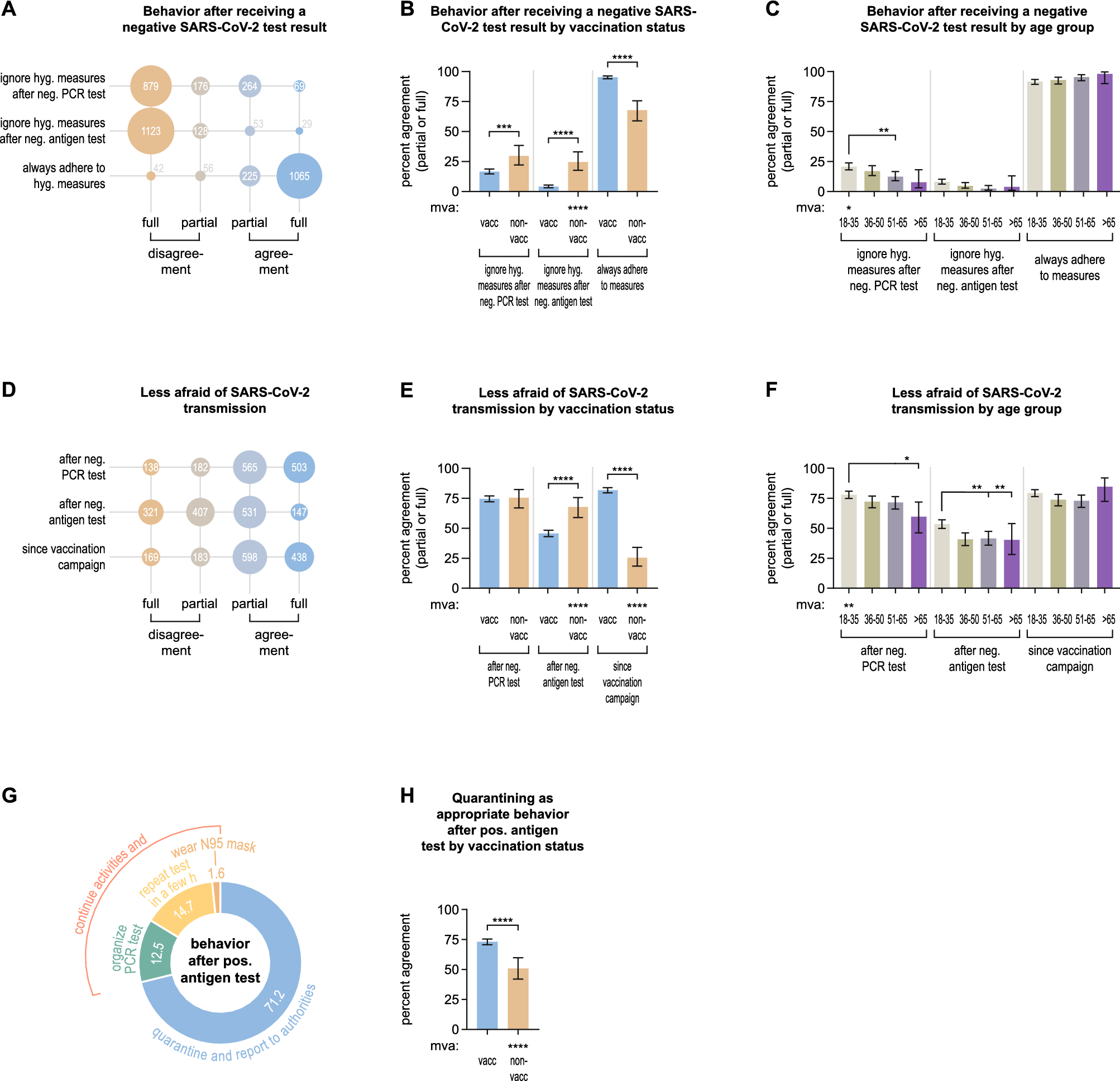 Behavior after receiving a SARS-CoV-2 test result. A Agreement and disagreement (partial and full) on being willing to ignore hygiene measures shortly after receiving a negative PCR or RAT result and the statement that it is always necessary to adhere to COVID-19 specific hygiene measures regardless of testing among all 1388 participants. B, C Percentages of all participants agreeing (partially or fully) to being willing to ignore hygiene measures after receiving a negative test result or to adhere to hygiene measures, stratified by vaccination status (B) and age group (C). D Agreement and disagreement (partial and full) for being less afraid of SARS-CoV-2 transmission after receiving a negative PCR or RAT result specifically and, in general, since the beginning of the vaccination campaign. E, F Percentages of all participants agreeing (partially or fully) to being less afraid after receiving a negative test result or, in general, since the beginning of the vaccination campaign by vaccination status (E), and age group (F). G Participants’ responses on what they believe is the appropriate behavior after receiving a positive RAT. Data is shown as percentages of all 1388 participants. H Percentages of all participants agreeing that quarantining is the appropriate behavior after receiving a positive RAT by vaccination status. Absolute numbers of participants giving certain answers are displayed in (A, D). Error bars in (B, C, E, F, H) indicate 95% confidence intervals. Asterisks above brackets indicate statistical significance between groups calculated with Fisher’s exact test (B, E, H), and Fisher’s exact test with Holm’s testing correction (C, F). Asterisks next to “mva” indicate statistical significance in multivariate analysis. If no asterisks are given, no statistical significance was detected. h—hours, hyg.—hygiene, mva—multivariate analysis, neg.—negative, non-vacc—non-vaccinated, pos.—positive, vacc—vaccinated