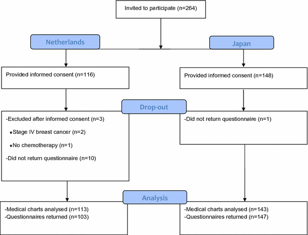 A total of 264 women (116 Dutch and 148 Japanese) agreed to participate. After informed consent, three patients in the Netherlands were excluded because they did not receive chemotherapy (n = 1) or were found to have distant metastases (n = 2). Sociodemographic and clinical variables were gathered for 256 patients, and 250 patients returned their questionnaires (Fig. 1).