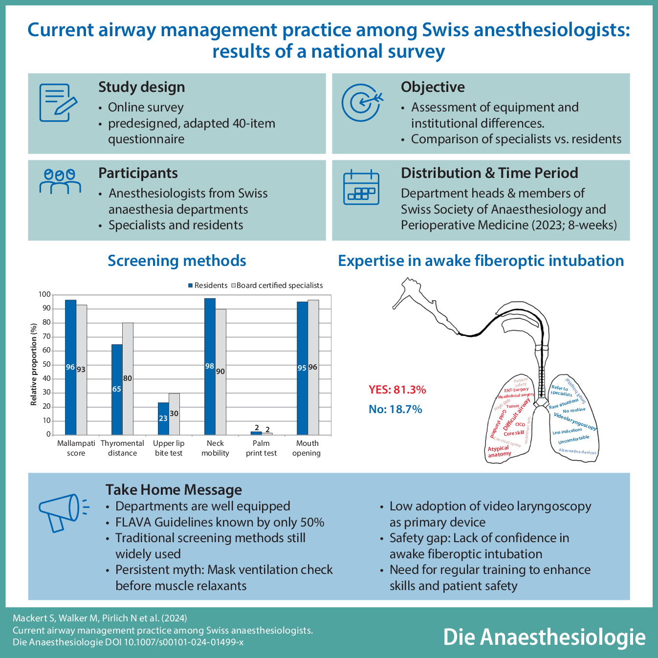 Overall, 555 anesthesiologists participated in the survey (response rate 21%). The main findings were: in general, Swiss anesthesia departments are well-equipped and adhere to airway management guidelines. The guidelines of FLAVA are only known by just over 50%. The vast majority used the traditional screening tests to identify an airway that might be potentially difficult to manage. Of the respondents, 25% still adhere to the myth that a mask ventilation check is necessary before the administration of a muscle relaxant and 14% said that their institution used video laryngoscopy as the primary intubation device. More than 80% think that the expertise to perform awake fiberoptic intubation is important for their daily practice; however, 31% consider their expertise in this technique to be insufficient. In other words, there is a big safety gap.