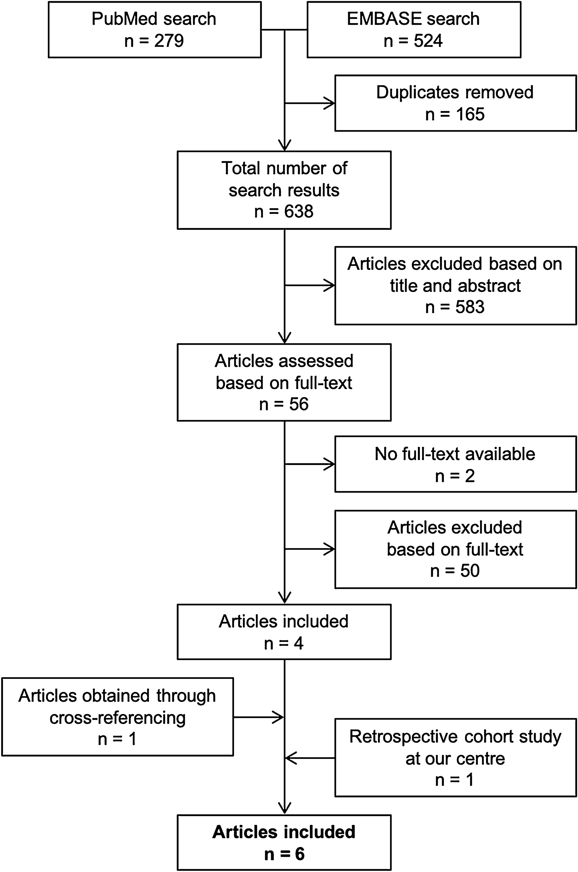 The literature search was performed on 22 February 2020. The PubMed search resulted in 279 hits and the Embase/MEDLINE search yielded 524 hits, resulting in a total of 803 hits. After removal of 165 duplicates, 638 studies were assessed based on title and abstract. 583 articles did not fulfil the inclusion criteria and were therefore excluded. 56 studies were assessed based on full-text, of which 4 studies were included in the current review. For two studies, no full-text article was available and these studies were therefore excluded. Cross-referencing yielded one additional included study. The results of a retrospective cohort study conducted at our level-1 trauma centre, which appeared online in February 2020, were also included in the analysis (Fig. 1).