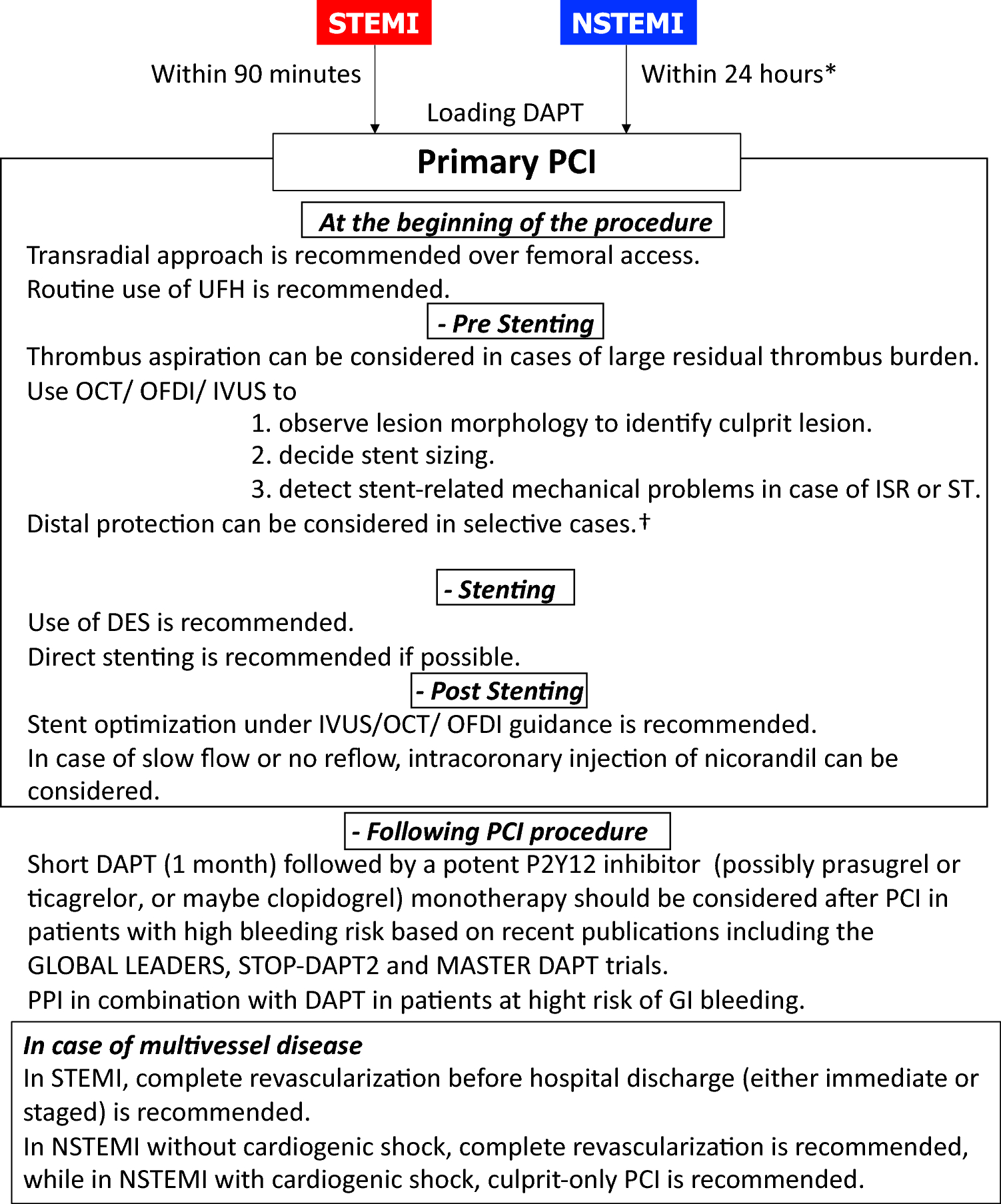 Updated guidelines for the management of acute myocardial infarction (AMI) were published by European Society of Cardiology (ESC) in 2017 and 2020 [20, 21]. Major changes in the guidelines for STEMI patients include recommendations for: (1) radial access and drug-eluting stent (DES) over bare-metal stent (BMS) as a Class I indication; and (2) complete revascularization before hospital discharge (either immediate or staged) as a Class IIa recommendation. Primary PCI is consistently recommended in the updated guidelines as well as the previous guidelines [22]. In the guidelines for NSTEMI patients, the followings were changed: (1) an early invasive strategy within 24 h is recommended in patients with NSTEMI as a Class I indication; (2) complete revascularization in NSTEMI patients without cardiogenic shock is considered as Class IIa recommendation; and (3) in patients with atrial fibrillation, following a short period of triple antithrombotic therapy (up to 1 week from the acute event), dual antithrombotic therapy (e.g., DOAC and single oral antiplatelet agent preferably clopidogrel) is recommended, with cessation of the antiplatelet after 6 to 12 months [21].