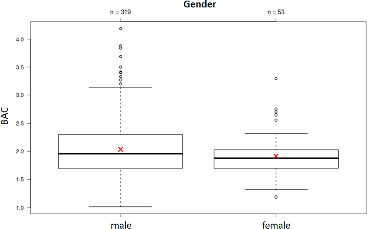 BAC comparison of males (N = 319) and females (N = 53; y-axis). The boxes contain 50% of the observations, the line inside the box indicates the respective median, the red crosses indicate average values and the satellites and respective outliers indicate 25% of the tested observations