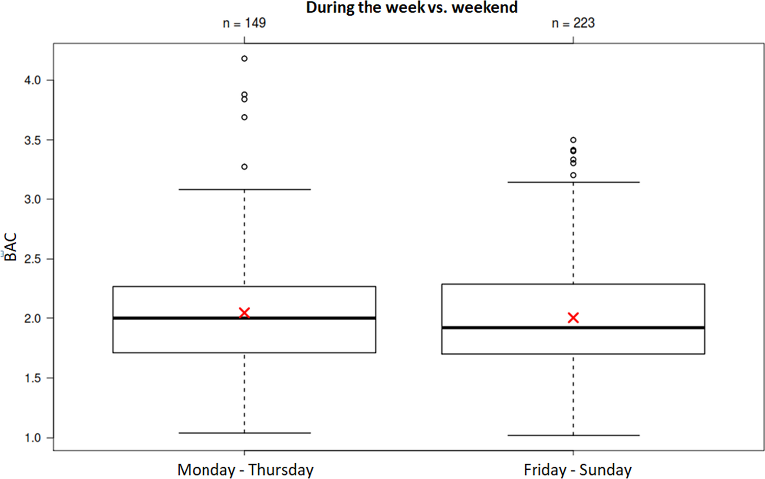 Most cases (N = 223) were recorded from Friday until Sunday (the “weekend”, Friday N = 70, Saturday N = 73, Sunday N = 80), and 149 cases were recorded from Monday until Thursday (the “work week”; Monday N = 30, Tuesday N = 34, Wednesday N = 41, Thursday N = 44). A significant difference in the BAC levels between the “weekend” and the “work week” could not be determined (p = 0.43; Fig. 2).