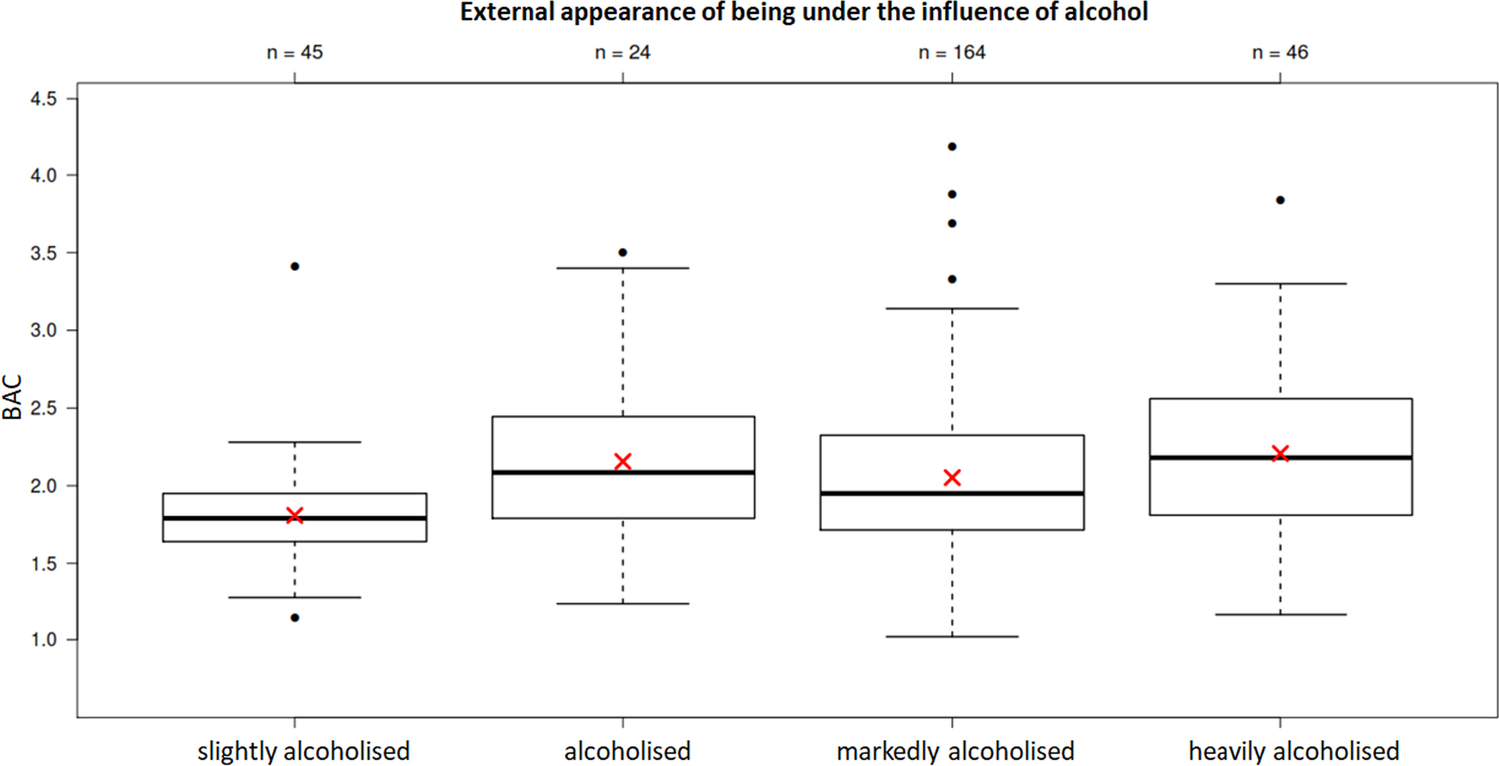 Comparison of defendants’ BACs (y-axis) with the external appearance of being under the influence of alcohol (“slightly influenced”/N = 45, “influenced”/N = 24, “markedly influenced”/N = 164, “heavily influenced”/N = 46)