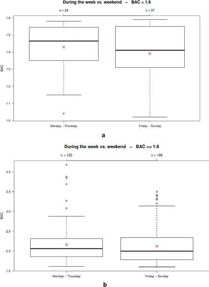 a. Comparison of BACs (y-axis) in defendants with BACs below 1.60 g/kg during the “work week” (Monday–Thursday; N = 24) and the “weekend” (Friday–Sunday; N = 37). b. Comparison of BACs (y-axis) in defendants with BACs of at least 1.60 g/kg during the “work week” (Monday–Thursday; N = 125) and the “weekend” (Friday–Sunday; N = 186)