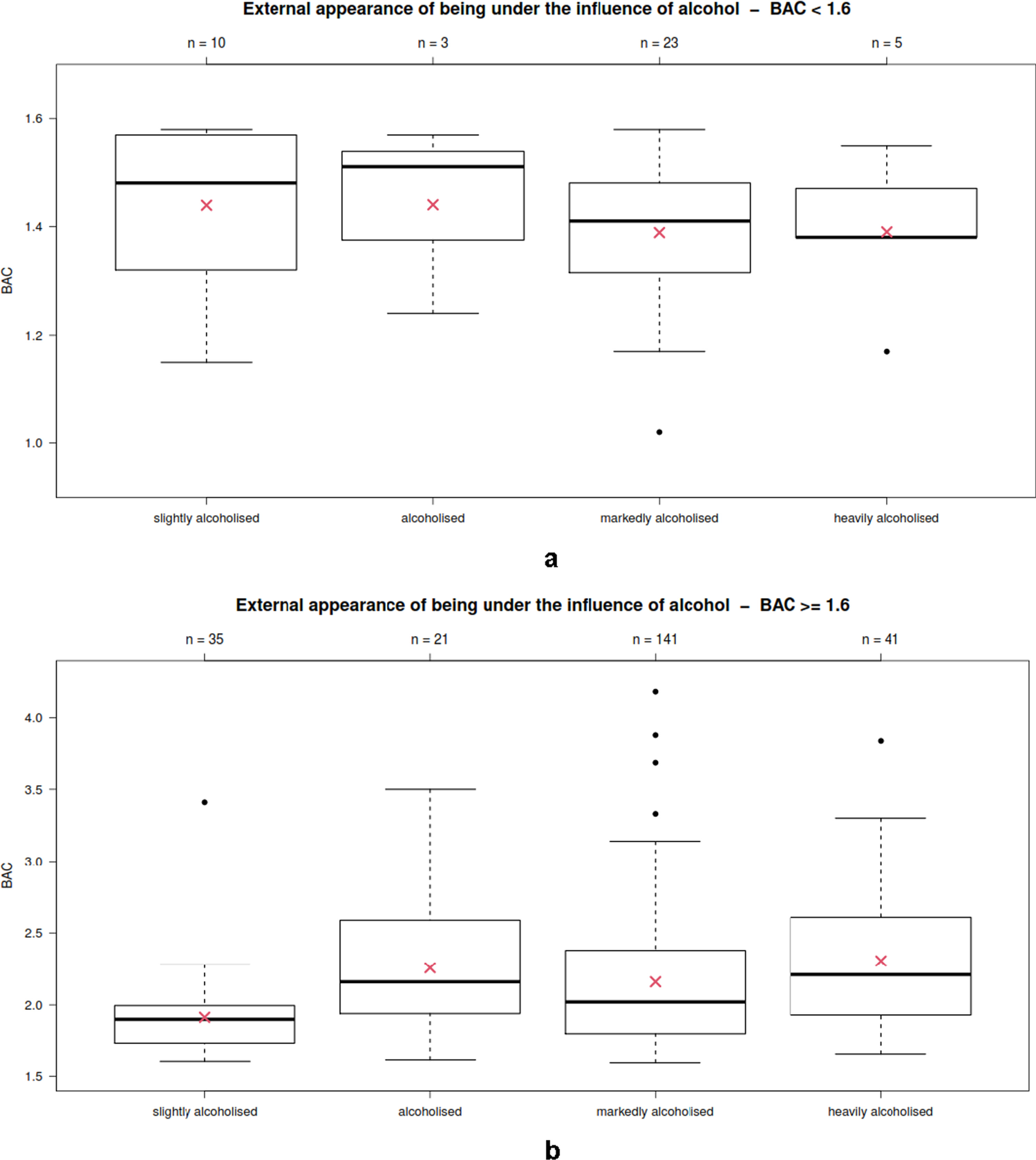 a. Comparison of BACs (y-axis) in defendants with BACs below 1.60 g/kg with the external appearance of being under the influence of alcohol (“slightly alcoholised”/N = 10, “alcoholised”/N = 3, “markedly alcoholised”/N = 23, “heavily alcoholised”/N = 5). b. Comparison of BACs (y-axis) in defendants with BACs of at least 1.60 g/kg with the external appearance of being under the influence of alcohol (“slightly alcoholised”/N = 35, “alcoholised”/N = 21, “markedly alcoholised”/N = 141, “heavily alcoholised”/N = 41)
