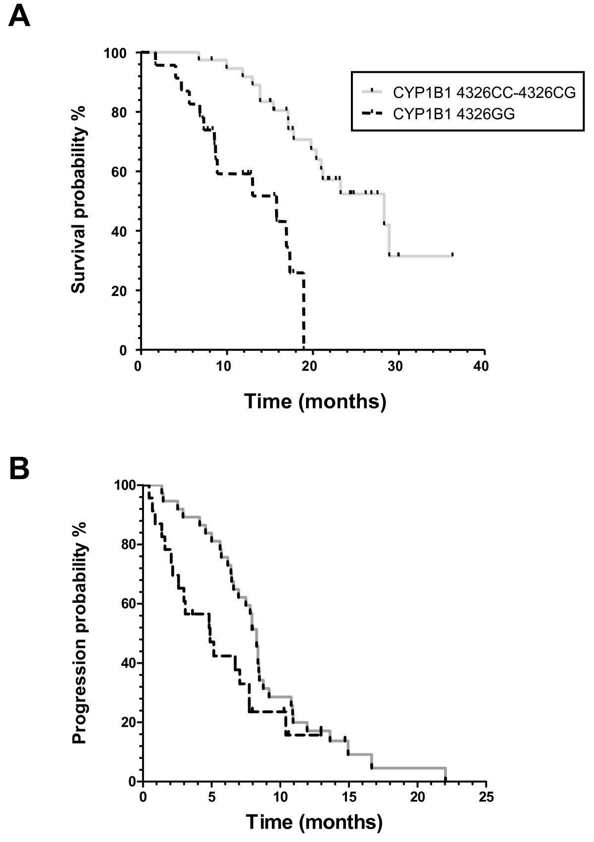 Furthermore, the CYP1B1 4326GG genotype was associated with significantly shorter PFS and OS, whereas no correlations were observed between both the grouped CYP1B1 4326GG and 412GG and the grouped CYP1B1 4326GG and 4390AG or 4390GG genotypes with PFS.
