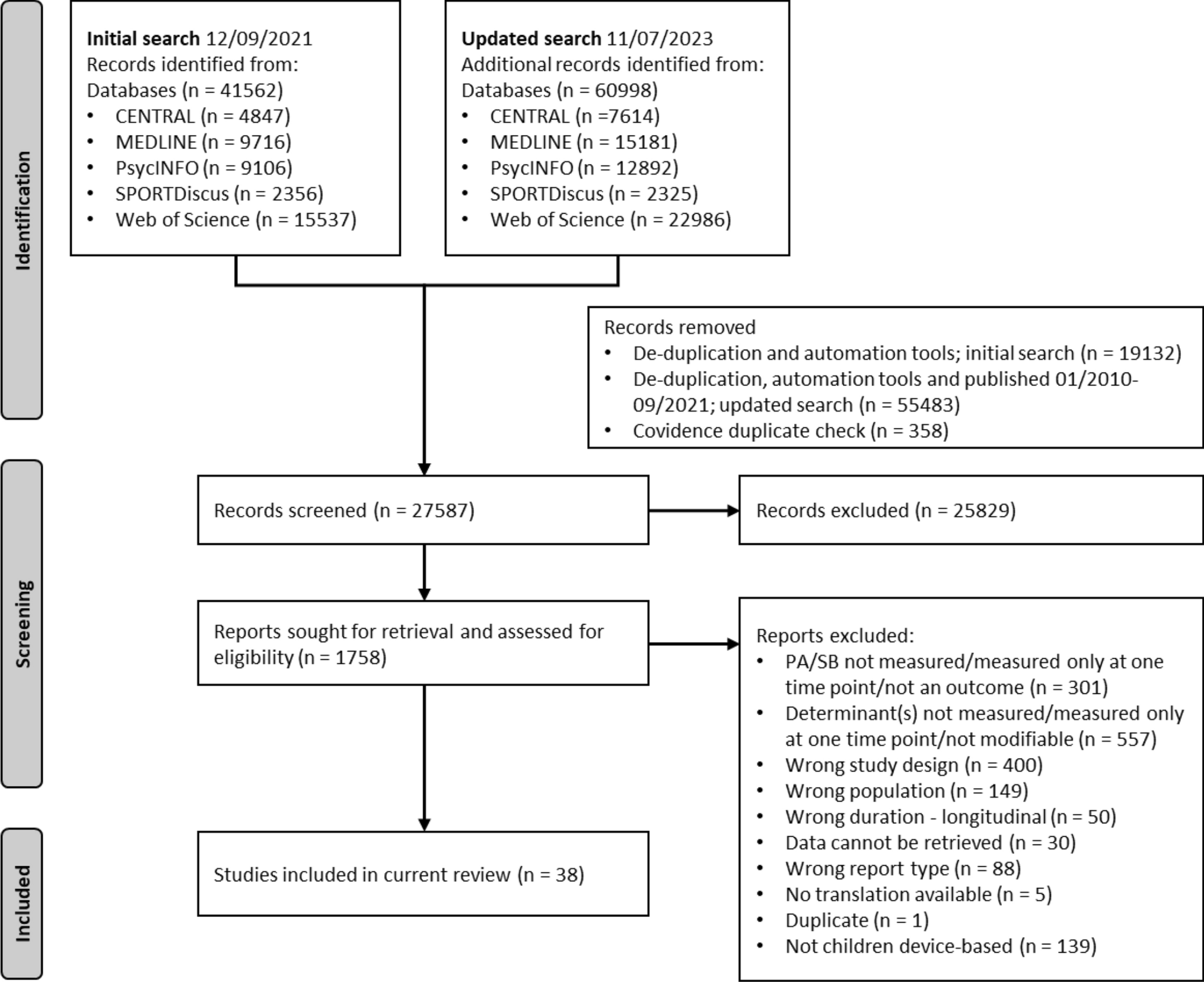 Measurement methodsb | (acceleromet*) OR ("activity profile") OR (recall) OR (diary) OR ("activity monitor*") OR ("heart rate monitor*") OR ("direct observation") OR (Actigraph*) OR ("activity track*") OR ("self report*") OR (survey) OR (pedomet*) OR (wearable*) |