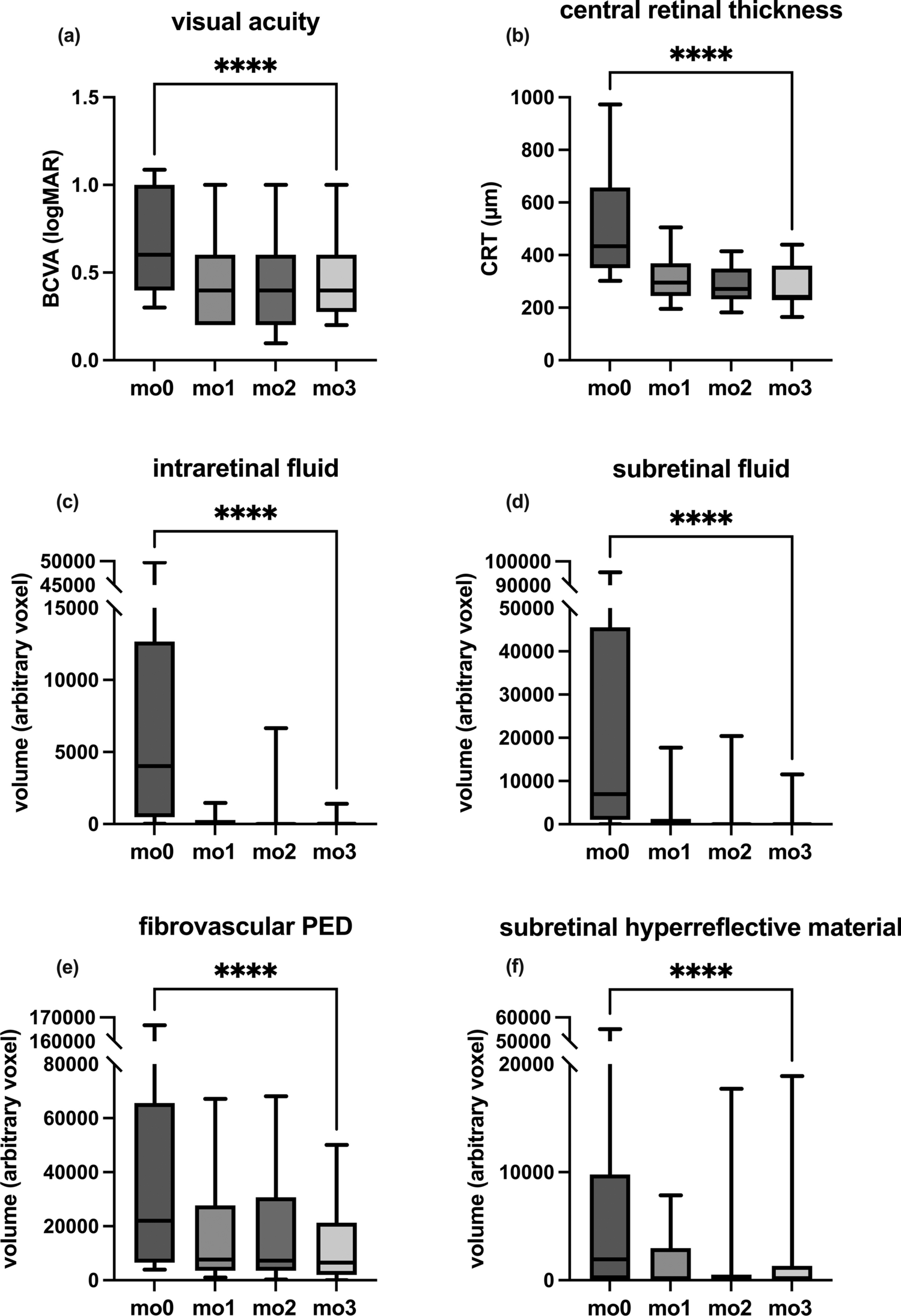 Development of biomarkers during therapy with intravitreal faricimab [a best corrected visual acuity (BCVA); b central retinal thickness (CRT); c intraretinal fluid (IRF); d subretinal fluid (SRF); e fibrovascular pigment epithelium detachment (fvPED); f subretinal hyperreflective material (SHRM)]. Timepoints are mo0 (day of first faricimab injection, patient is treatment naïve), mo1 (day of second faricimab injection), mo2 (day of third faricimab injection), mo3 (day of fourth faricimab injection). p value of pairwise comparison between m0 and m3 given by asterixis (****p < 0.0001)