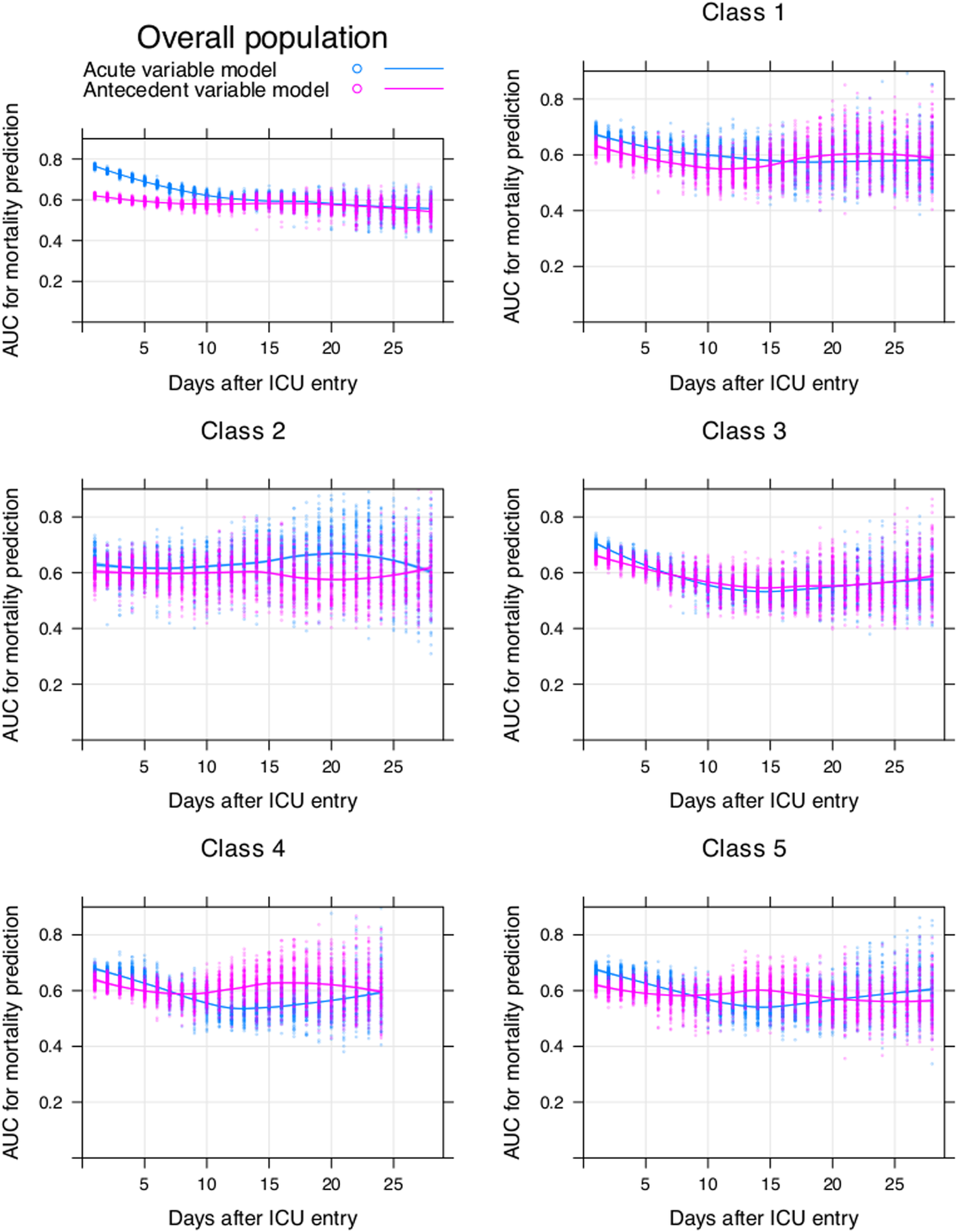 The day on which acute variables no longer more predictive than antecedent variables | 16 | 27 | 6 | 7 | 8 | |