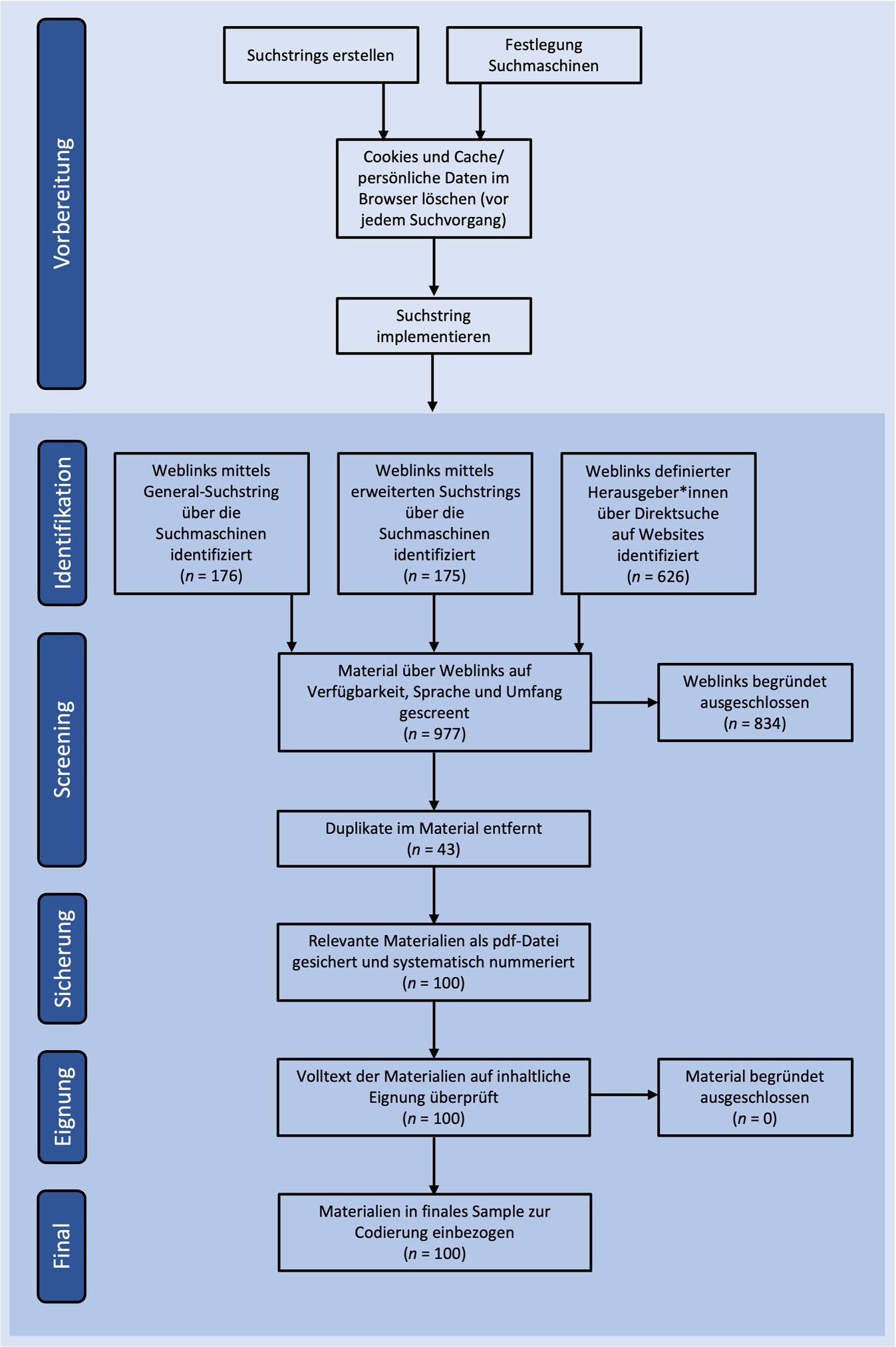 Insgesamt wurden 977 recherchierte Links gescreent und hinsichtlich der Inklusionskriterien geprüft. 143 Materialien wurden heruntergeladen und um doppelte Materialien (n = 43) bereinigt, womit das finale Sample N = 100 beträgt.