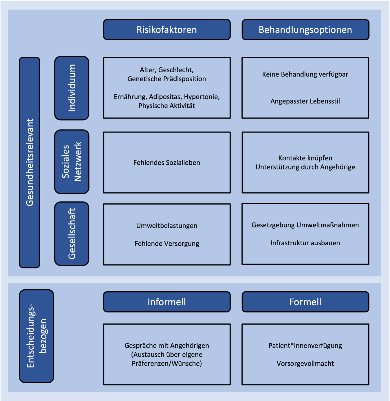 Diese haben keinen direkten Einfluss auf den Gesundheitszustand, sondern können Entscheidungen unterstützen, die die Gesundheit fördern. Bezogen auf Demenz müssen entweder die Menschen mit Demenz selbst Entscheidungen treffen, sofern sie juristisch dazu in der Lage sind, oder Angehörige entscheiden stellvertretend. Unterscheiden lassen sich innerhalb der entscheidungsbezogenen Faktoren formelle (juristisch bindende) und informelle Maßnahmen. Letztere sind individuell zu ergreifen und nicht an Vorgaben der Legislative gebunden.