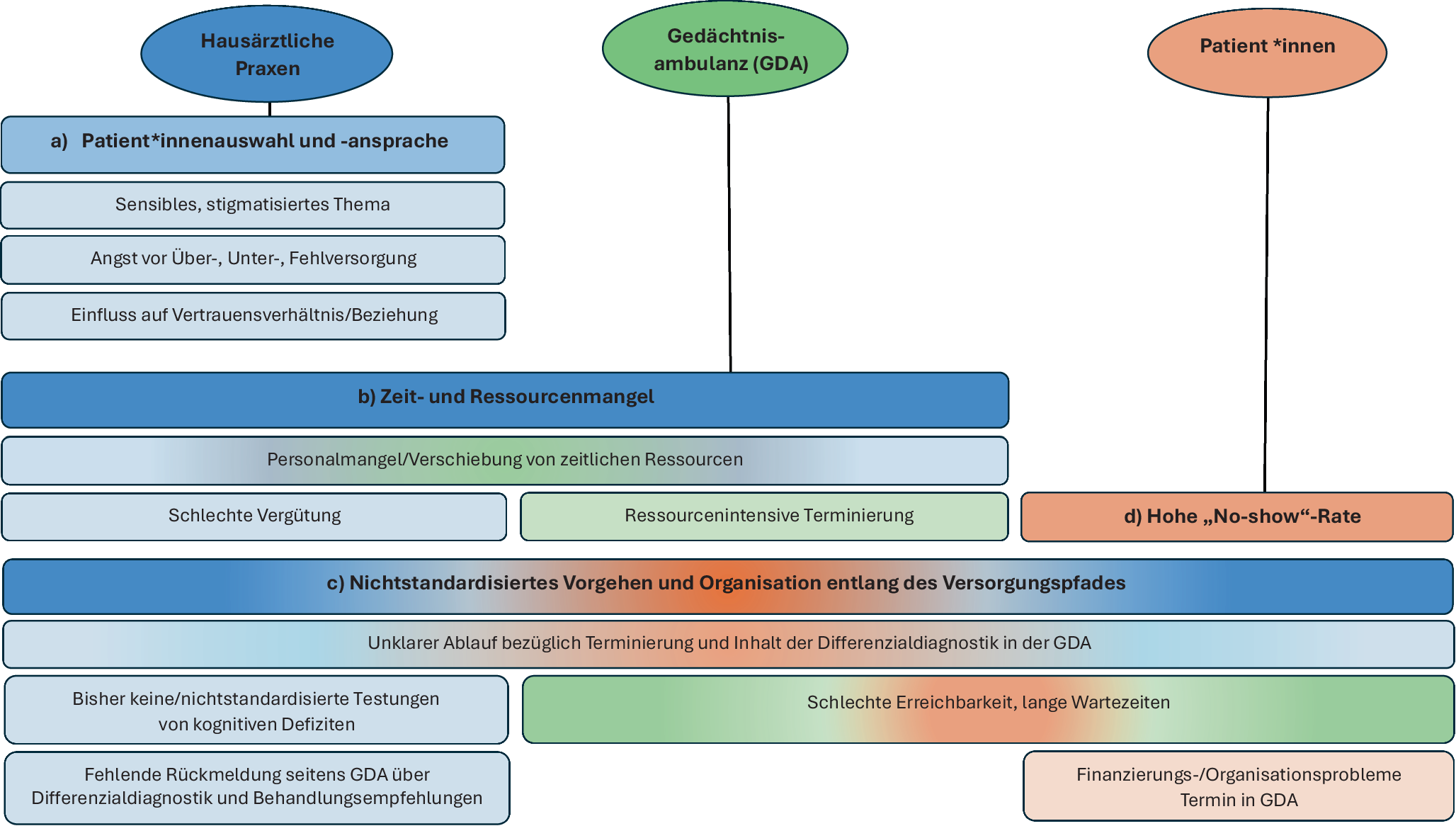 19], dass der Kognitionstest in die Versorgung integrierbar, akzeptiert und technisch umsetzbar ist. Gleichzeitig wurden projektspezifische Hürden im gesamten Versorgungspfad deutlich; diese werden in einer Sekundäranalyse aufbereitet und im Weiteren kritisch diskutiert. Vor diesem Hintergrund stellen sich die Fragen: Welche projektspezifischen Hürden beeinflussen die Demenzdiagnostik in der hausärztlichen Versorgung und wie können digitale Case-Finding-Ansätze zu deren Überwindung beitragen?
